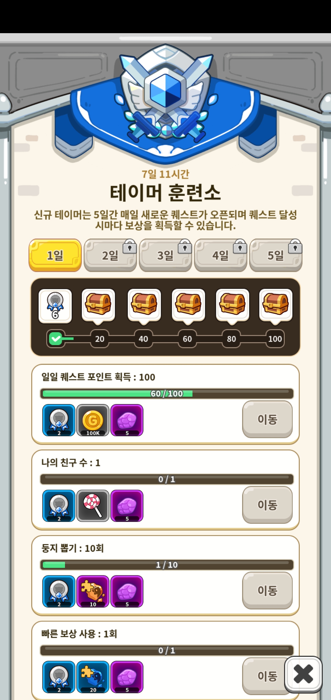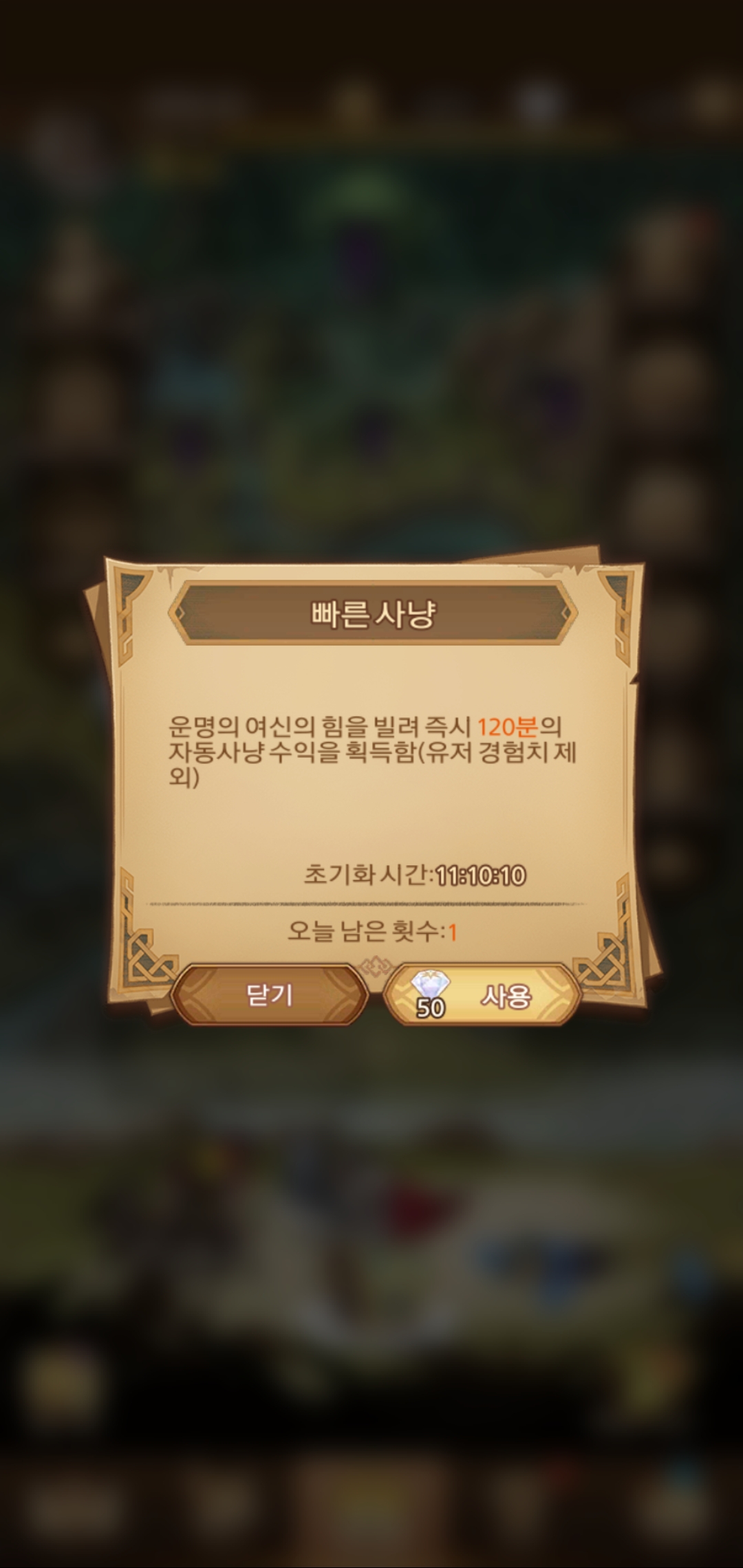 하루에 2번 사용 가능, 2회차에는 보석 50개 필요, 한 번 당 120분 건너뛰기인 점으로 완벽히 동일하다.