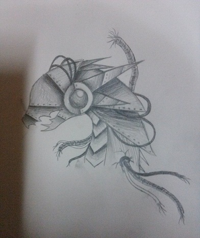 뭔 정신으로 그렸는지 모르겠는데 아마 인간들에게 잡혀서 기계화되다가(아마 전투력을 향상시켜서 군대로 만든다는 설정이었던것 같음) 기계화되는 고통 때문에 도중에 탈출했다는 설정이라 추정중... 대강 적혀있긴 한데 그걸 글로 쓰질 않아서;;; ㅋㅋㅋㅋ 저 아래쪽에 전선 박혀있는 부분은 기계화가 되지 않은 부분입니다