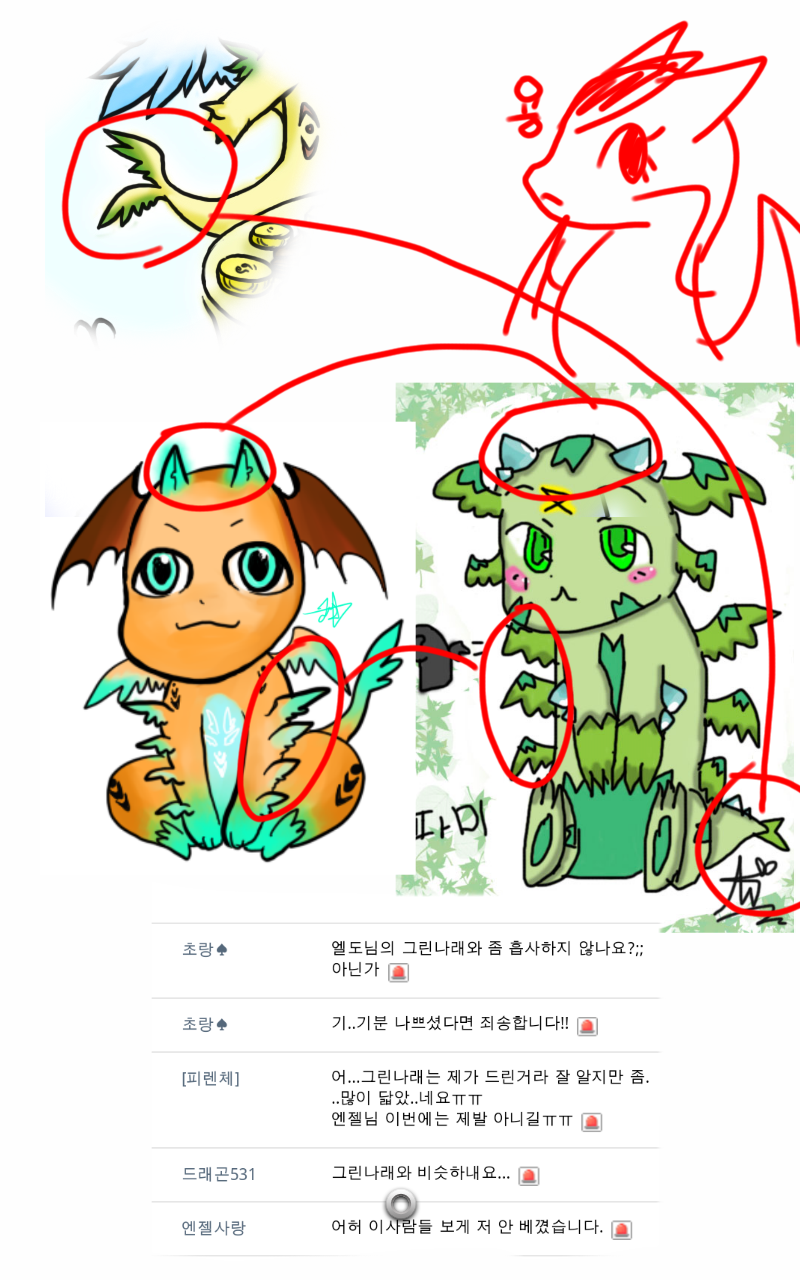사나래사진은 엘도님것이고 그린나래꼬리는 요루님그림입니다.. 문제된다면 내리겠습니다..허락안받고 써서죄송해요.. 음 엔젤사랑님 파미와 나래는 매우흡사합니다. 뿔, 많은날개..꼬리.. 예전에도 그려셨는데 또그러시나요? 수댕이님 추댓짤아이디어도 도용하시고..실망입니다.