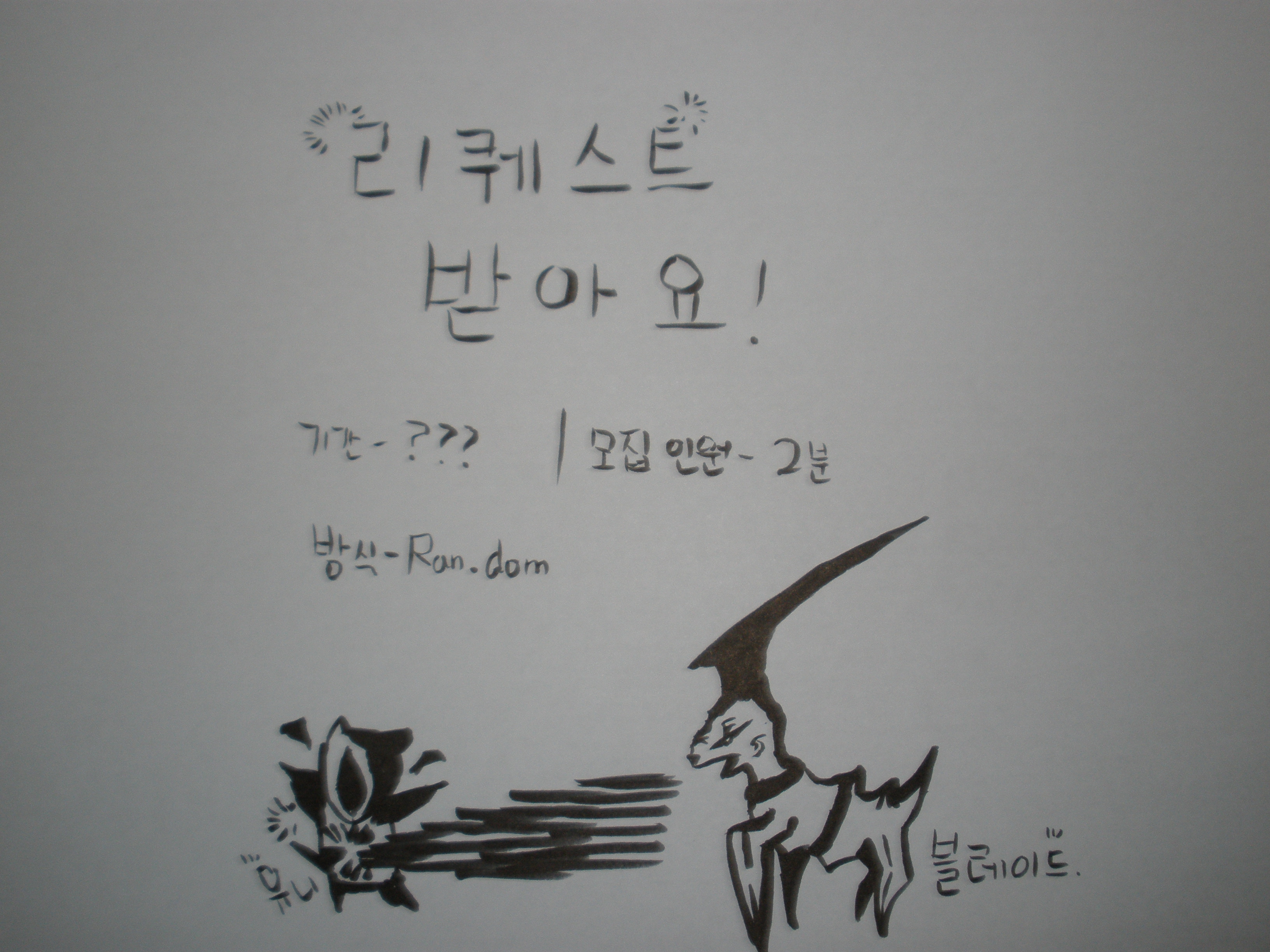 갤게오면 리퀘스트란것도 하시더군요?신입은 그딴거 잘 못그려드릴수도 있습니다...;;그래도 2-3분정도 리퀘스트 받아봅니다!(퀄 저하)