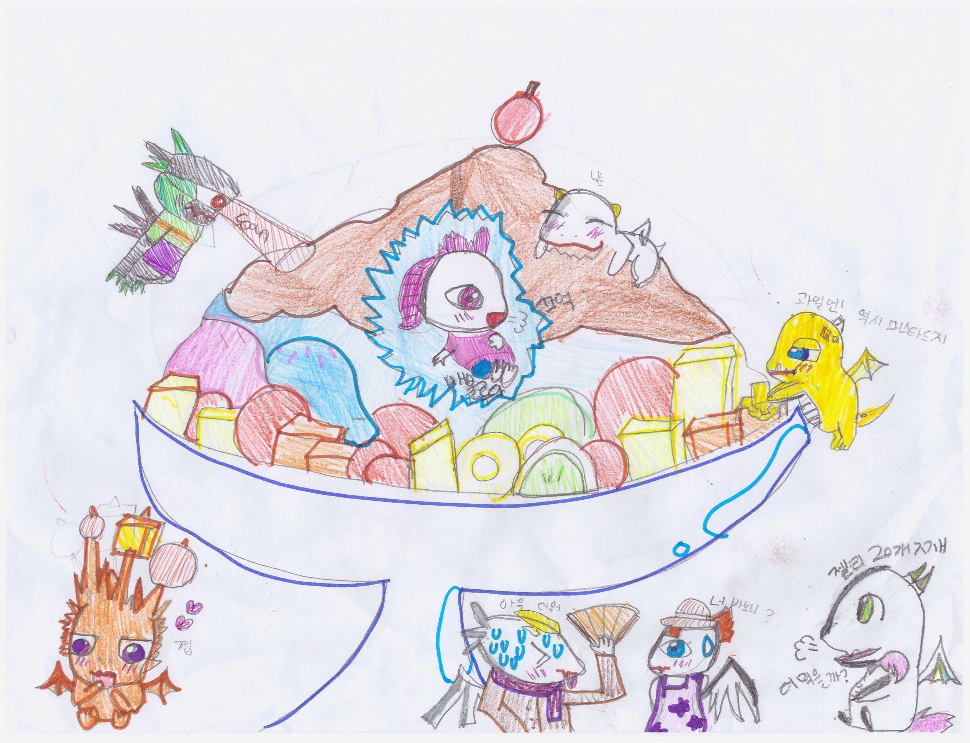 한번 연필 작으로, 드래곤이 빙수를 먹는 모습을 그려보고 싶어서 그려