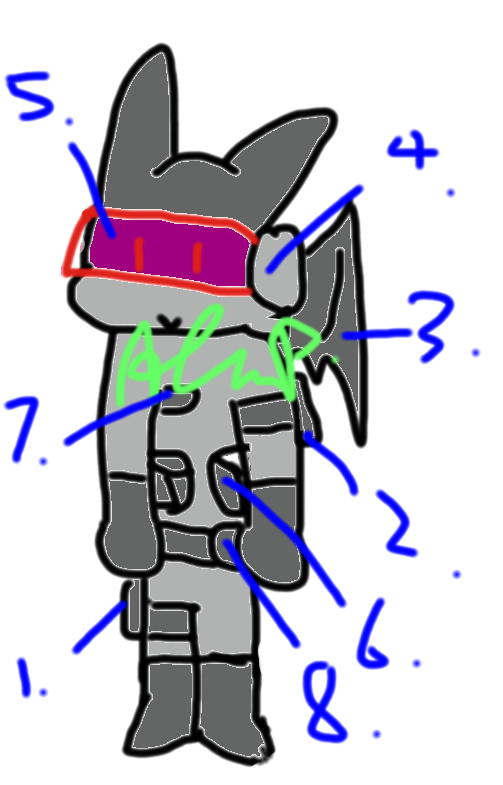 이제 자캐소개를(뜯어먹기)... 이름: 스와트(S.W.A.T.) 성별: M 속성: 어둠(이유는 기억이 안나지만 어쩌다 그렇게 됨) 번호 설명: 1번- 권총 슬롯 2번- 예비 바이저 건전지 (전의 건 너무 이상해서 수정됨) 3번- 방탄날개(말 그대로 방패) 4번- 헤드셋(스캐너와 연결됨, 무전기와 비슷) 5번- 스캐너(목표물의 상태를 확인하고 총기와 연결되어 자동 조준을 함) 6번- 탄창 7번- 이름표 겸 주머니( 어쩌다가 왼쪽이 아닌 오른쪽으로 감) 8번- 탄창 및 수류탄 이상입니다, 모두 굿밤요!