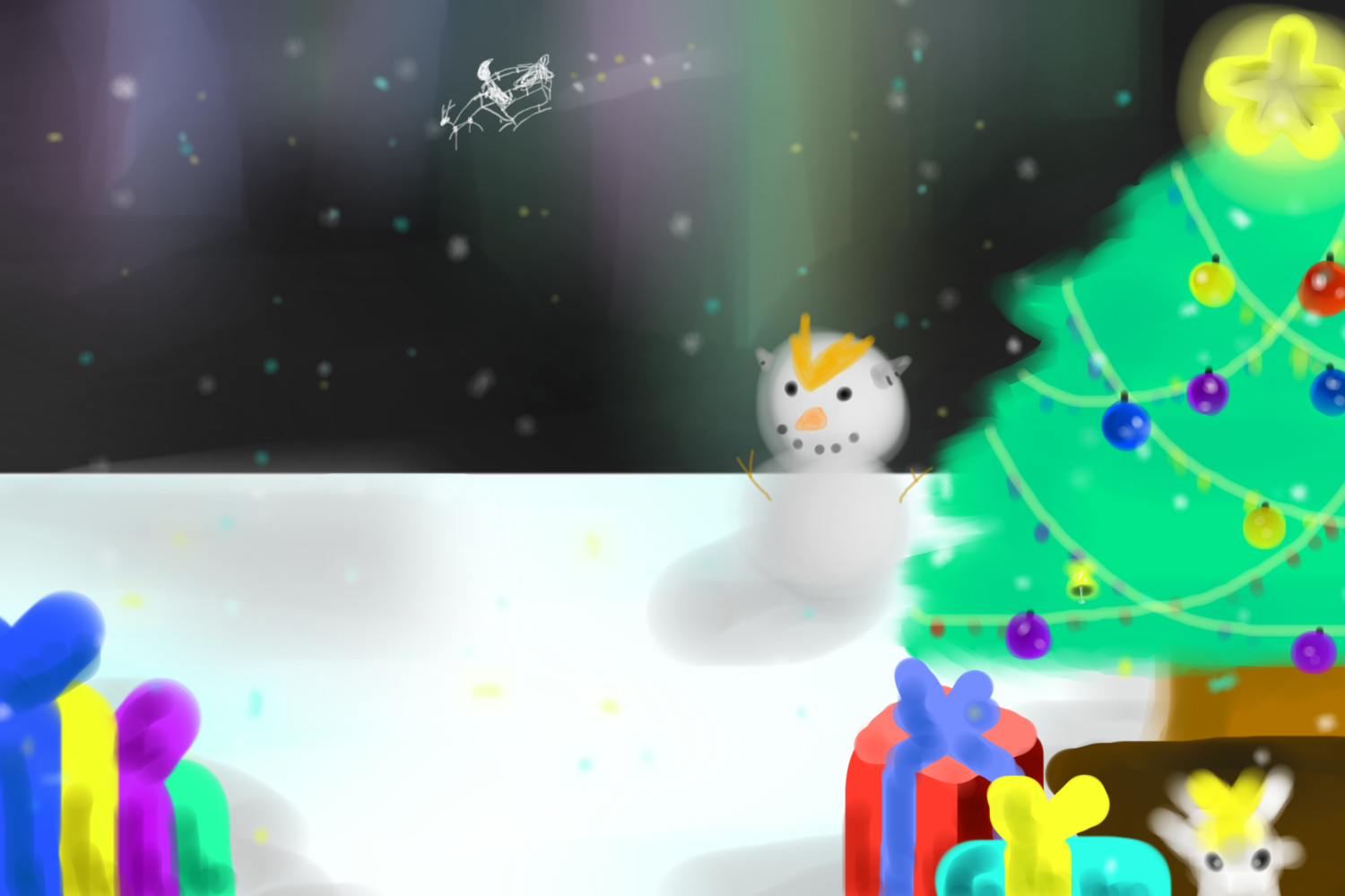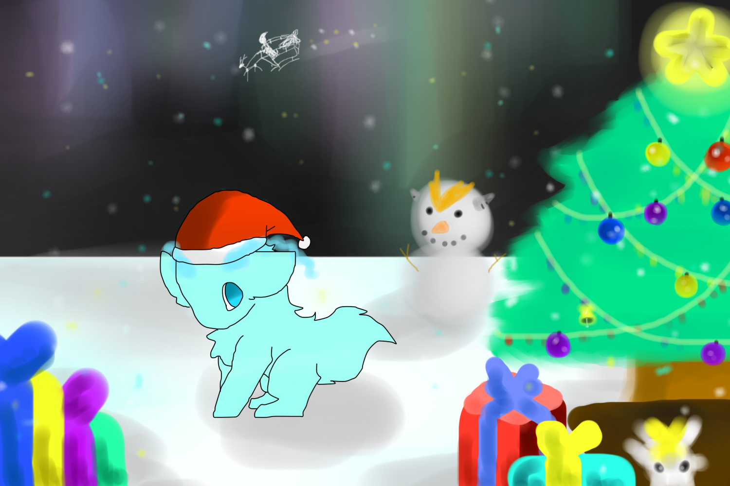 [드빌1/구미호 카즈/ 곧 크리스마스이기때문에 크리스마스풍으로 그려보았습니다! 밤하늘에는 여러색의 별과 오로라가 띄어져있으며, 산타와 순록형태의 그림자도 보이네요! 크리스마스트리에는 여러장식과 함께 주위에 선물상자와 고신인형이 놓여져있습니다. 뒤에는 번개고룡 비스무리한 눈사람도 보이고요.