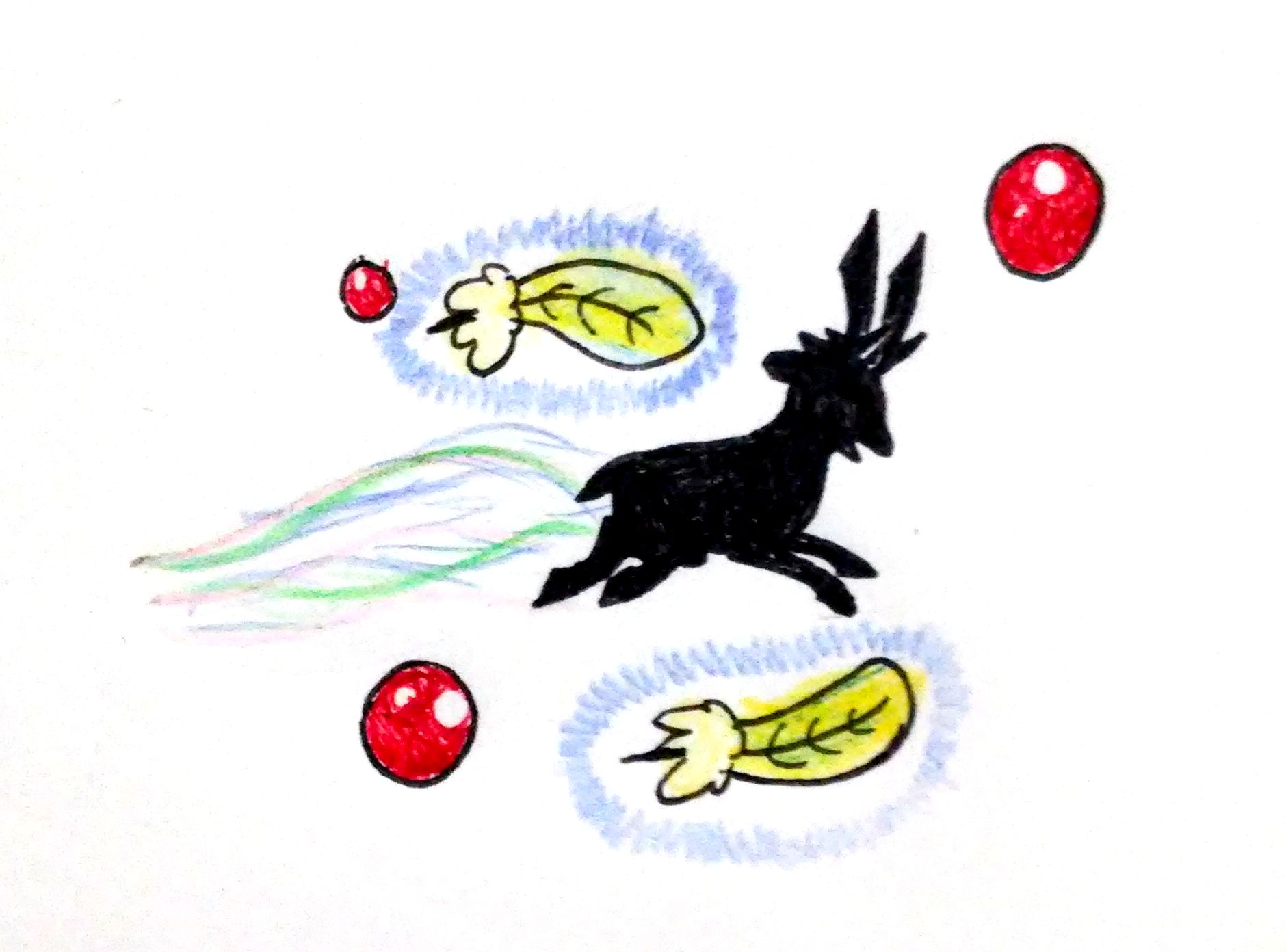 밤이되면 날개의 빨간방울에서 빛이 나는데, 산타와 소통을 할 수 있는 유일한 신호등같은 것이다.