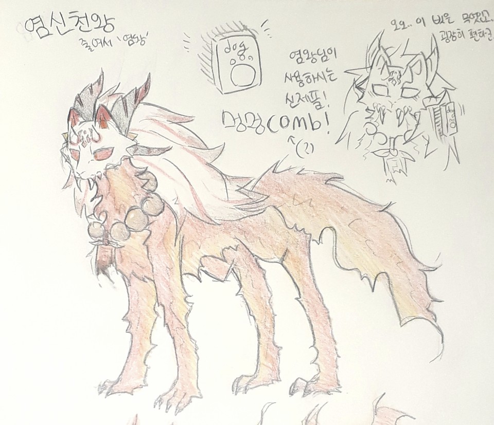 특징ㅣ목에 불에 탄 부적이 있는데 그것은 배신의 증표라고 한다. 원래는 평범한 개에다가 부적을 걸면 복이 올거라는 독특한 풍습이 있었다. 염왕도 그 중 하나였다. 한때는 정말 평범한 개였던 염왕은 둘도없는 단짝이 있었다. 바로 인간. 하지만 그 인간은 자신을 안락사 시키려 하였고, 자신은 도망치다 차에 치여 죽었다. 그것을 영혼과 생명의 여신, 밀레나가 발견하고 도깨비불은 부적 안에 넣어 살렸다. 그리하여 지금의 염왕이 된것.