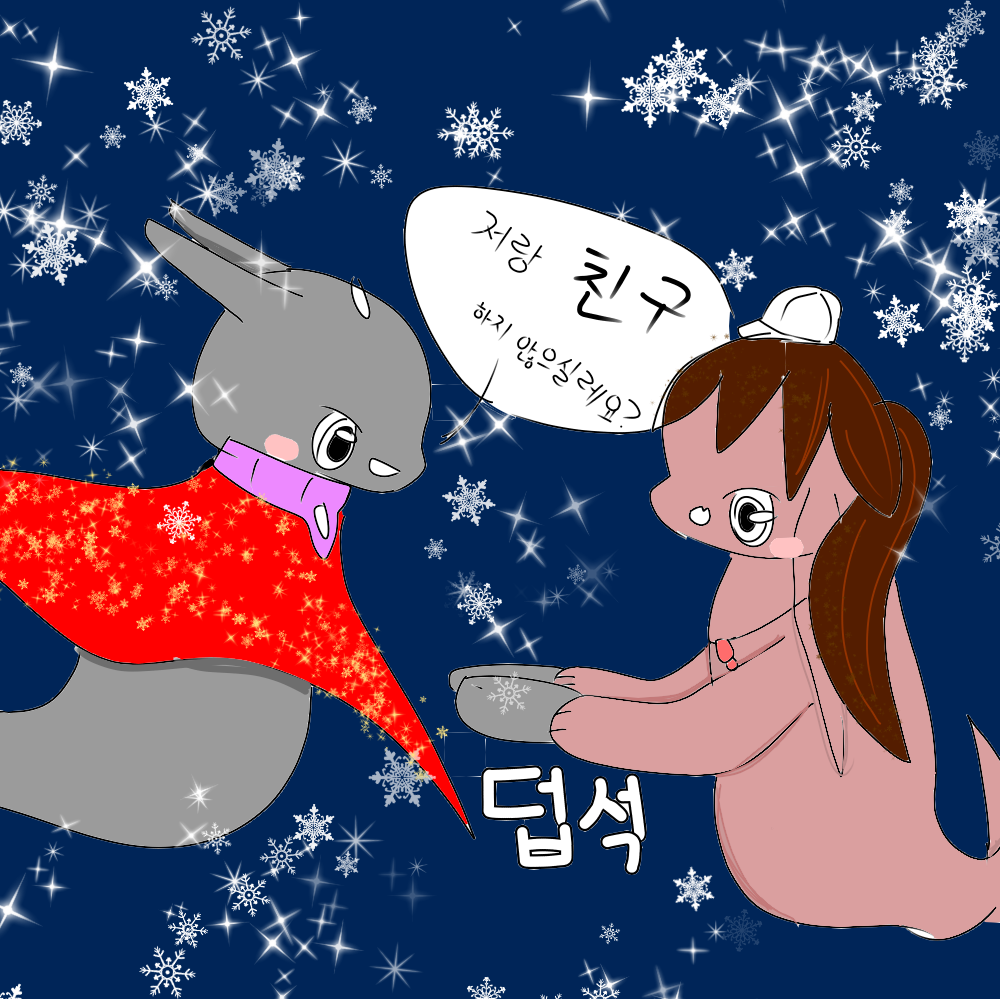 너무 반가워서 손을 덥석 잡고 "친구하자"라고 외치는 모습입니다