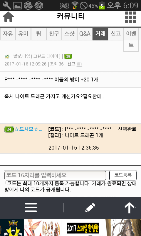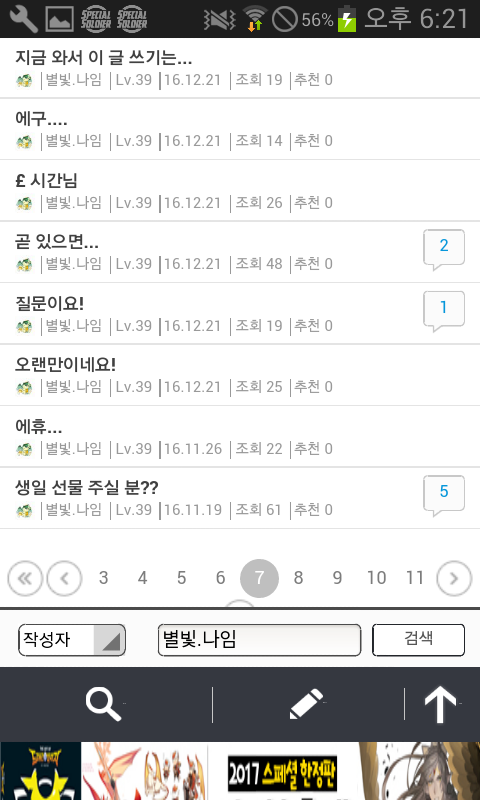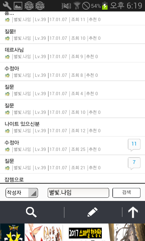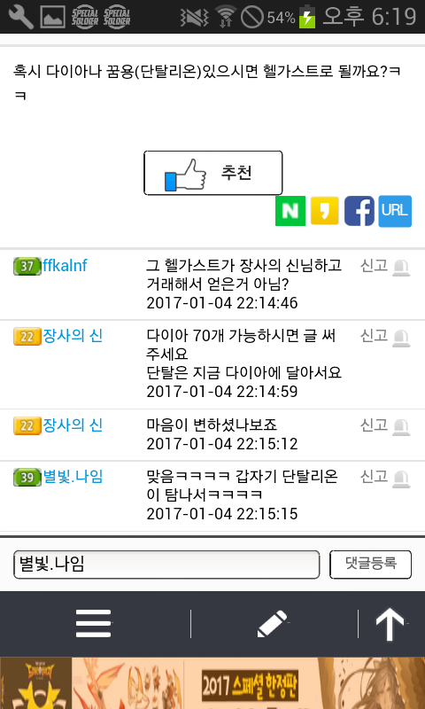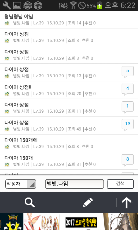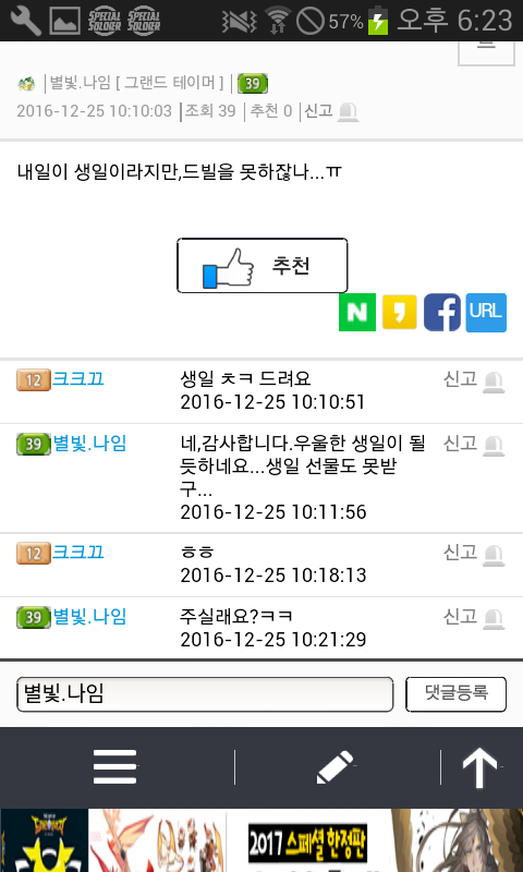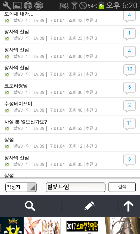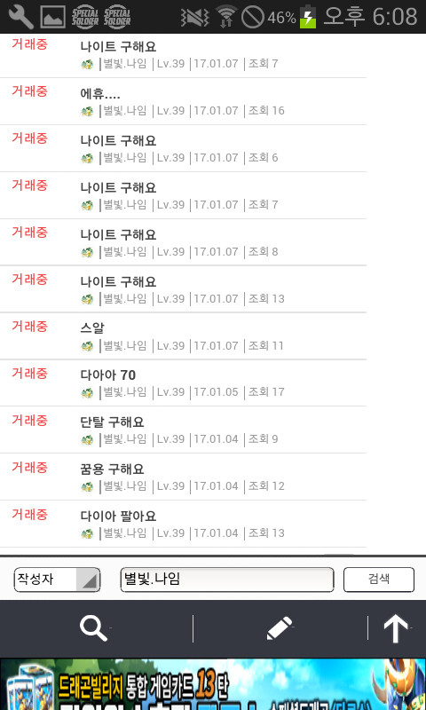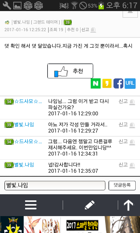 자게 눈팅..자주하는데 그때마다 나임님 글보기가 조금 그렇더라구요..^^ 잡젬가지고..나이트를 구하려 애쓰지를 않나..하루에 같은글만 엄청올리시질 않나..지난얘기지만 생일도 1년에 4일이나 되시구요.어떤분과 거래완료하신것이 갑자기 탐나서 다시 되돌려받은적도 있으시네요.거게에 글올리신거..댓안달리신다고 계속올리시는거 같은데..진짜 보기 않좋아요..ㅎㅎ 하루글수만..거의 한페이지 되시구요 (거의 같은내용)진짜..보기싫어도 참다가 잡젬으로 나이트구하시는거 보고..너무한거 아닌가 싶어서 글써봅니다."죄송합니다"하고 끝나는것이 아니고..믿음을 주셔야죠..^^생일빌미로 가루다 받으신다음 되파시려고 하시면 안되고요.사람을.. 알주는사람으.로 생각하지 마세요..한번..뭐줬다고..해서 또주는줄..아십니까?게다가..같은내용으로..도배 자제해주세요. 같은 자게인으로써..보기싫네요 홈피좀 같이씁시다?