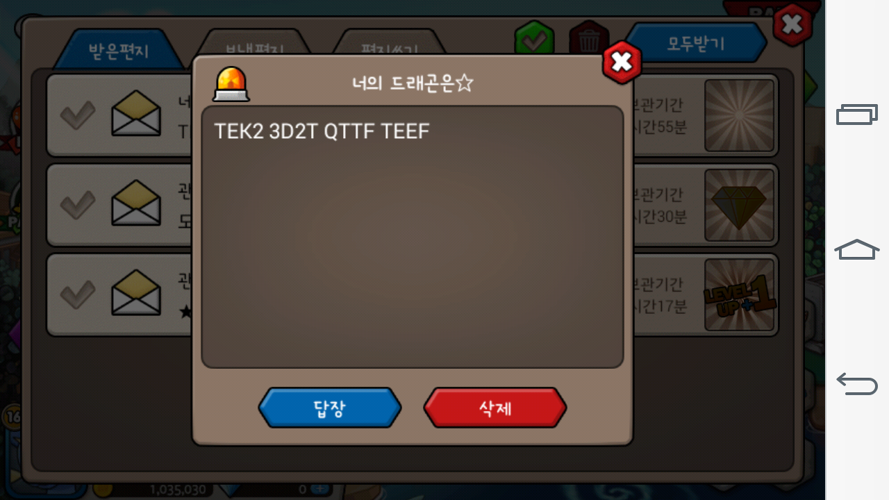님^^님이 편지를 안 받아서 홈피에 올리는대 님 정말 썼는대 존재하지 않다는대 뭐죠?여러분 진짜 이코드 써보시면 존재하지 않다는 걸 아실거예요.아무튼!너의 드래곤님아 진짜 나랑 장난하심 이 사진 보시면 코드가 있는대 왜 안 써지는 건지^^도대체 이해가 안가는군요.님선도 아닌대 먼저 달라고 그러고 내가 준 백룡은 이 사람 줬는대 이 사람 도감에 블퀸 있는대 왜 안줌?거게에 거래하자고 안하구^^어? 정말 짜증나군요....