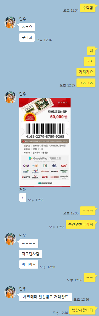 네이버에서 가져온 문상 5짜리 사진보내놓고 ㅋㅋㅋㅋㅋㅋㅋㅋㅋ갑자기 확인도안했는데 못얻냐고 난리치고그렇게 사기라고 느껴지면 컬쳐랜드에 누가썻는지 조회해보세요 ㅋㅋㅋㅋㅋㅋㅋㅋㅋㅋ개웃기네진짜 네이버에 퍼진사진가지고 분쟁일으키네요.그리고 님같은 ㅅㄲ한테 안팔고 SIN님과 잘거래했습니다^_^ 드리구요ㅋㅋㅋㅋㅋㅋㅋ