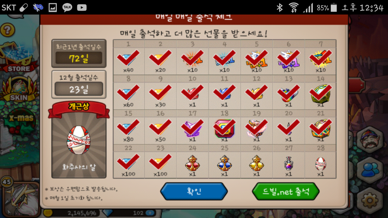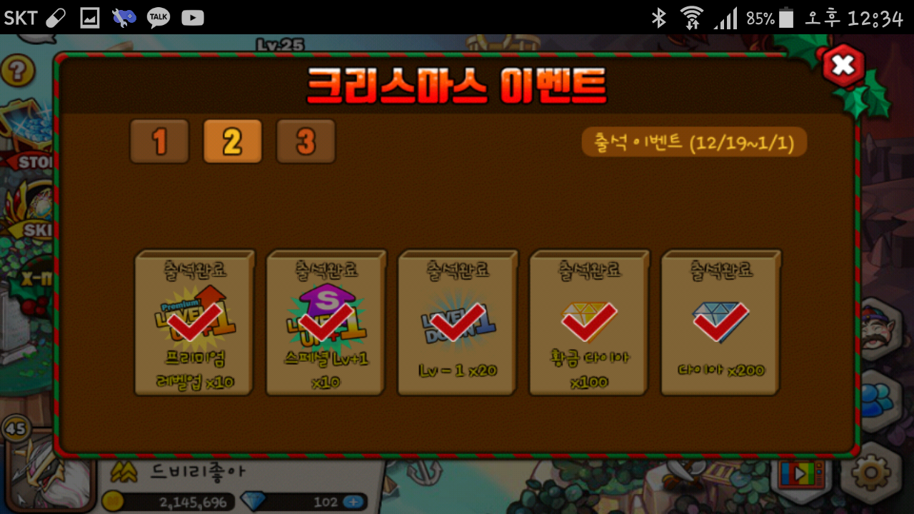 오늘만을 기다리고 기다렸는데 크리스마스 출석 이벤트다이아 2백개랑 일반 출석 황다100개 얻는 날이었는데 버그로 하나도 못 얻는게 말이 되요?!!!! 아니 어제 들어가고 안 꺼서 다시 나갔다 왔는데 출석은 되있지도 않은데 드가니까 일방적으로 주는 다이아 2개만 주고 출석에서는 황다 100개 다 받아져있다고 하는데 받아져있지도 않고 크리스마스 출석 다이아2백개도 우편함으로 전해져있다 하는데 우편함에서는 아무것도 없고 이게 뭐에요!!!?