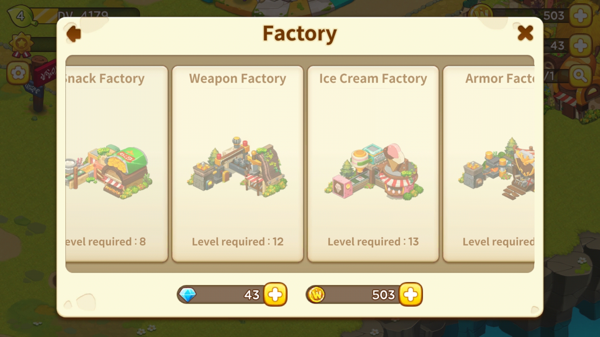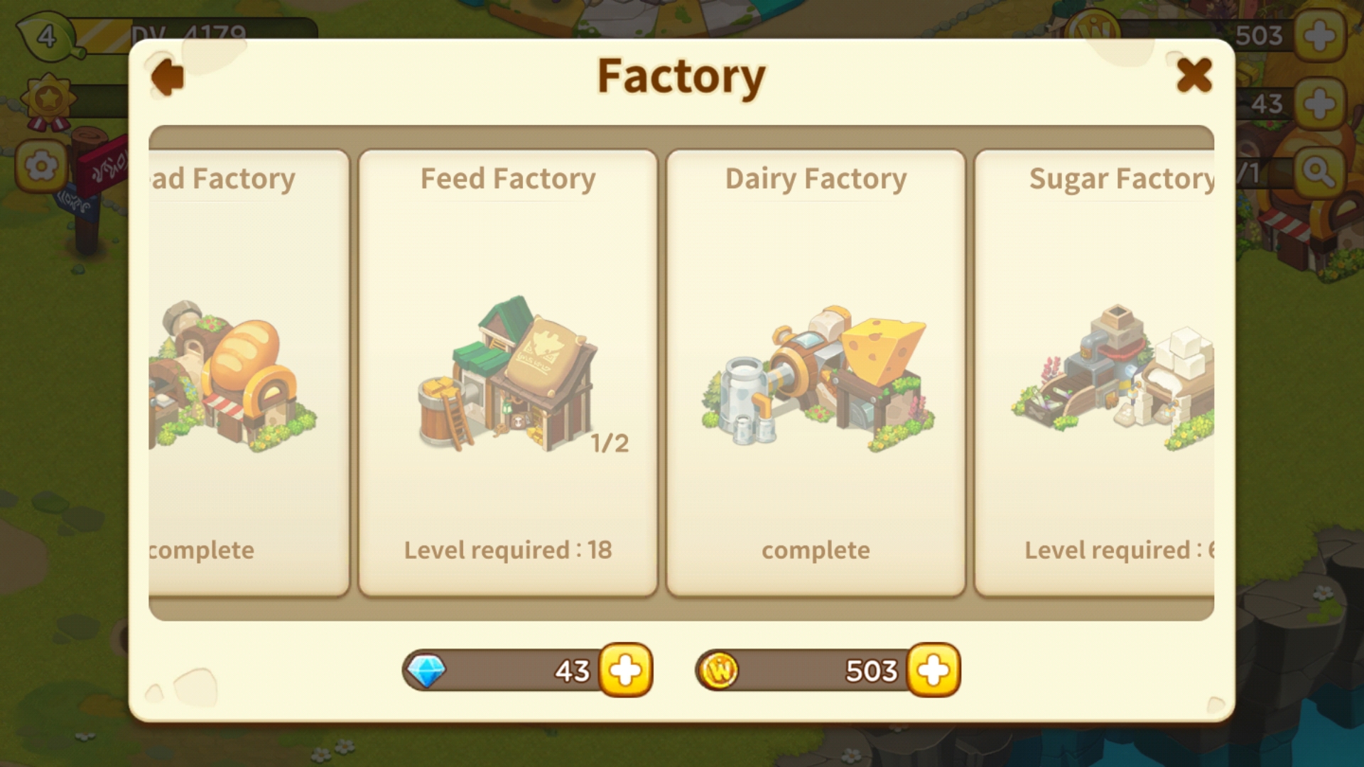 빵 공장 -> 유제품 공장 -> 설탕공장 -> 과자공장 -> 아이스크림 공장-> 옷감공장 -> 종이공장.... 다 꿈의 마을 게임 초반에 해금되는 공장들 입니다.