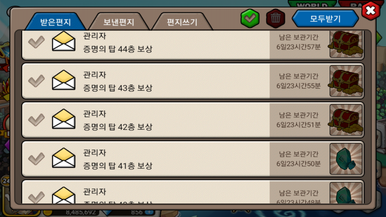 2시간모아서 증탑45층까지 갔거든요 근데 우편 보상 받았는데