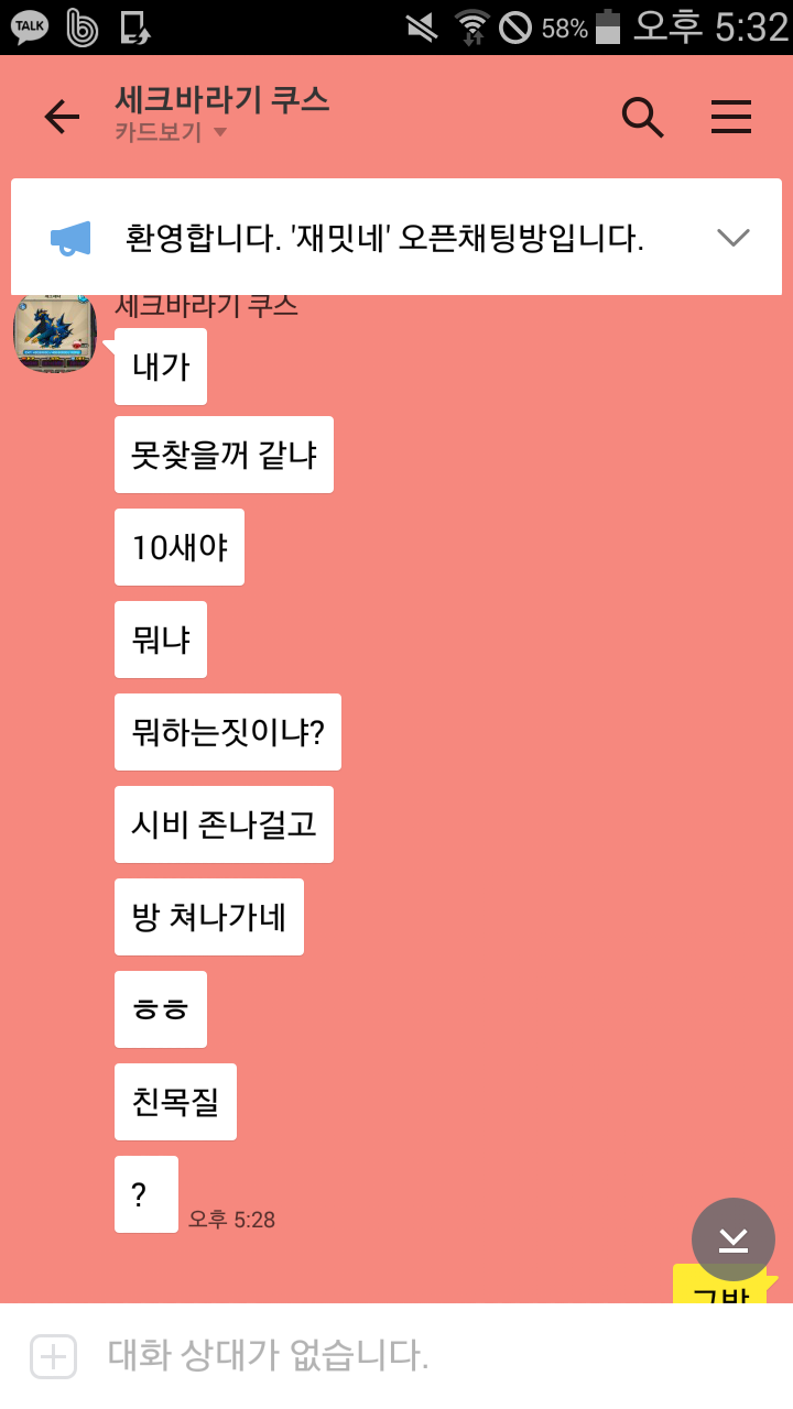 각성7.0 포도알 2.4.4.4개에 풀초없고 왕젬없는 계정 2에 케빈님이 파시길래 제 주관적으로 2정도는 아닌거 같아서 그렇게 말했더니 케빈님이 안사시면 됩니다 하길래 당연하다고 했습니다.그런데 케빈님이랑 자주 놀던 쿠스님이 방규칙에서 시비쪽이라고 갑자기 친목질하시길래 ㅇㅋ 규칙어긴건 저니 친목잘하시라고 하고 나갔습니다.근데 갑자기 프필톡 와서 욕을 하네요.그래서 비꼬는식으로 저도 대했져.그 톡방을 싫어하는건 아니지만 실수로 비하한건 죄송합니다.표현이 잘못됬네요.그런데 박제하시네요.욕있어서 박제하기 뭐했는데 올리게 됬습니다.박제 당해야하는 이유점 알려주세요.