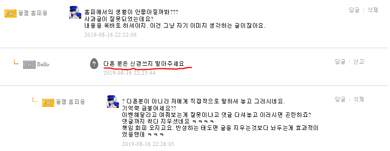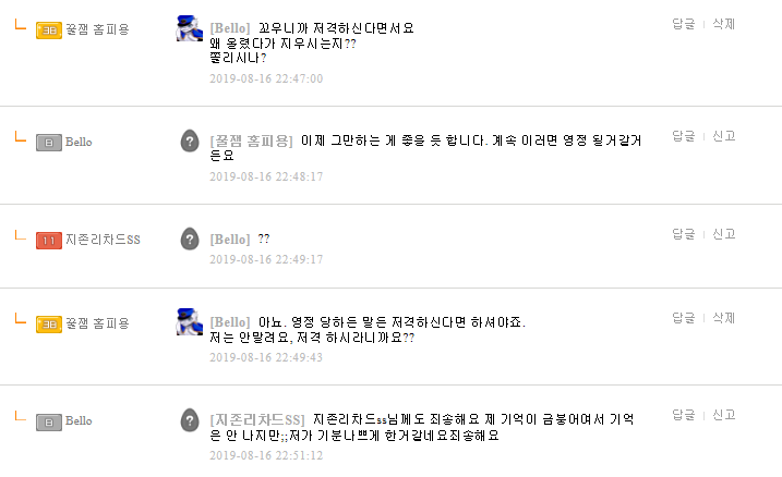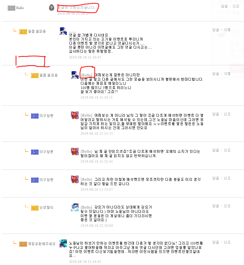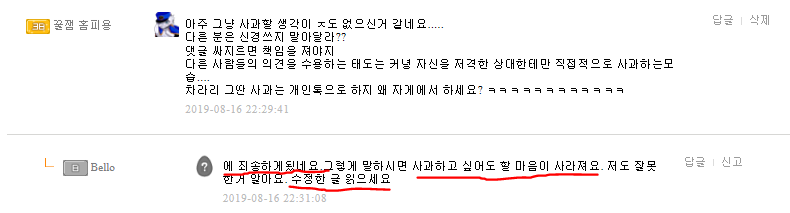 1. 잘못없다면서 대꾸한거는 bello가 먼저(빨간색 친거 보면 빈칸 보이죠?? 댓글 지운 흔적들이 남아있어요)