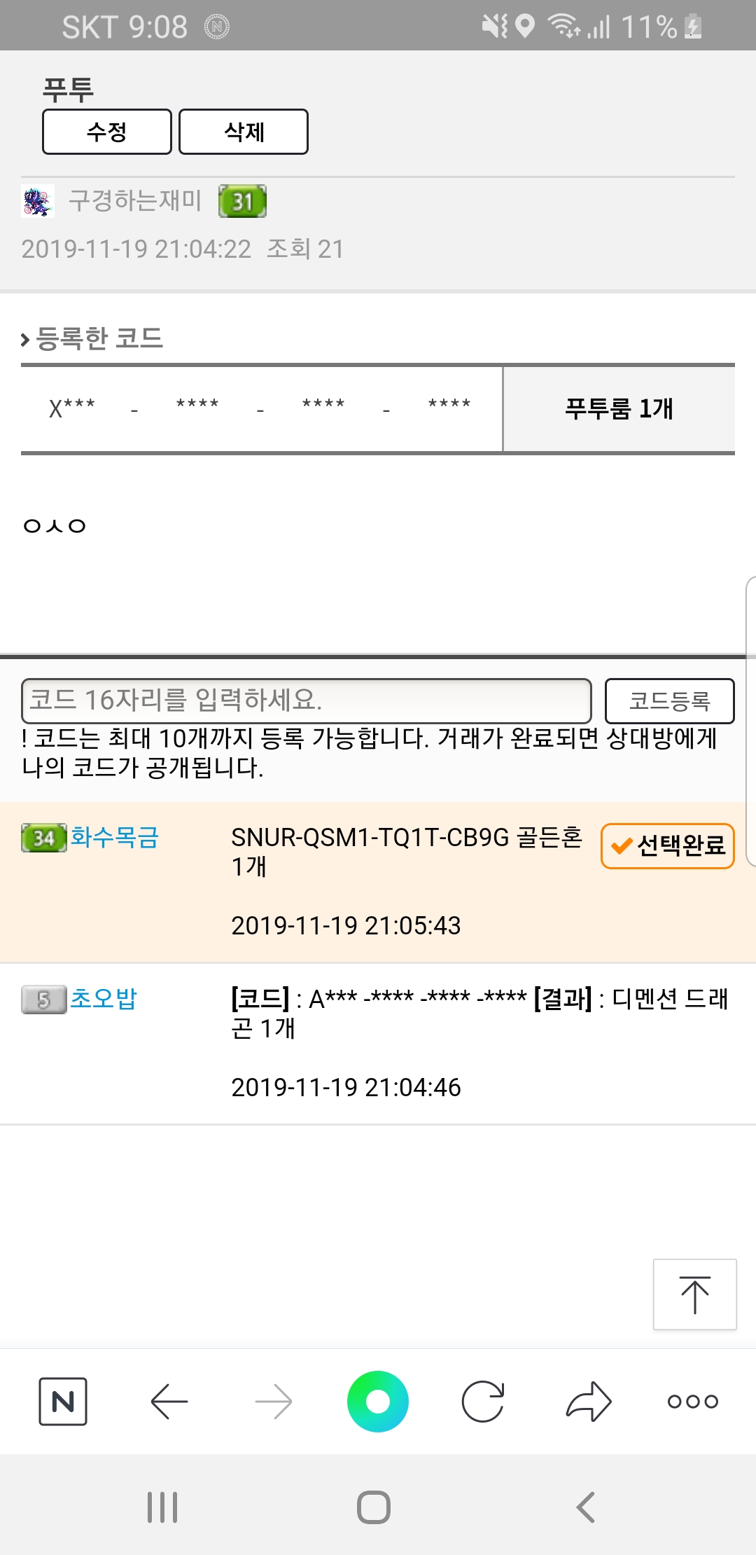 거래하고있는데 물론저도 거래중이라고 안써놓은 제잘못도 있지만 푸투에 디멘이뭐에요 화수목님 부곈줄알고속을뻔했네요...ㅜㅜ 제발 잡젯자제좀 해주세요...골든혼은 선☆물