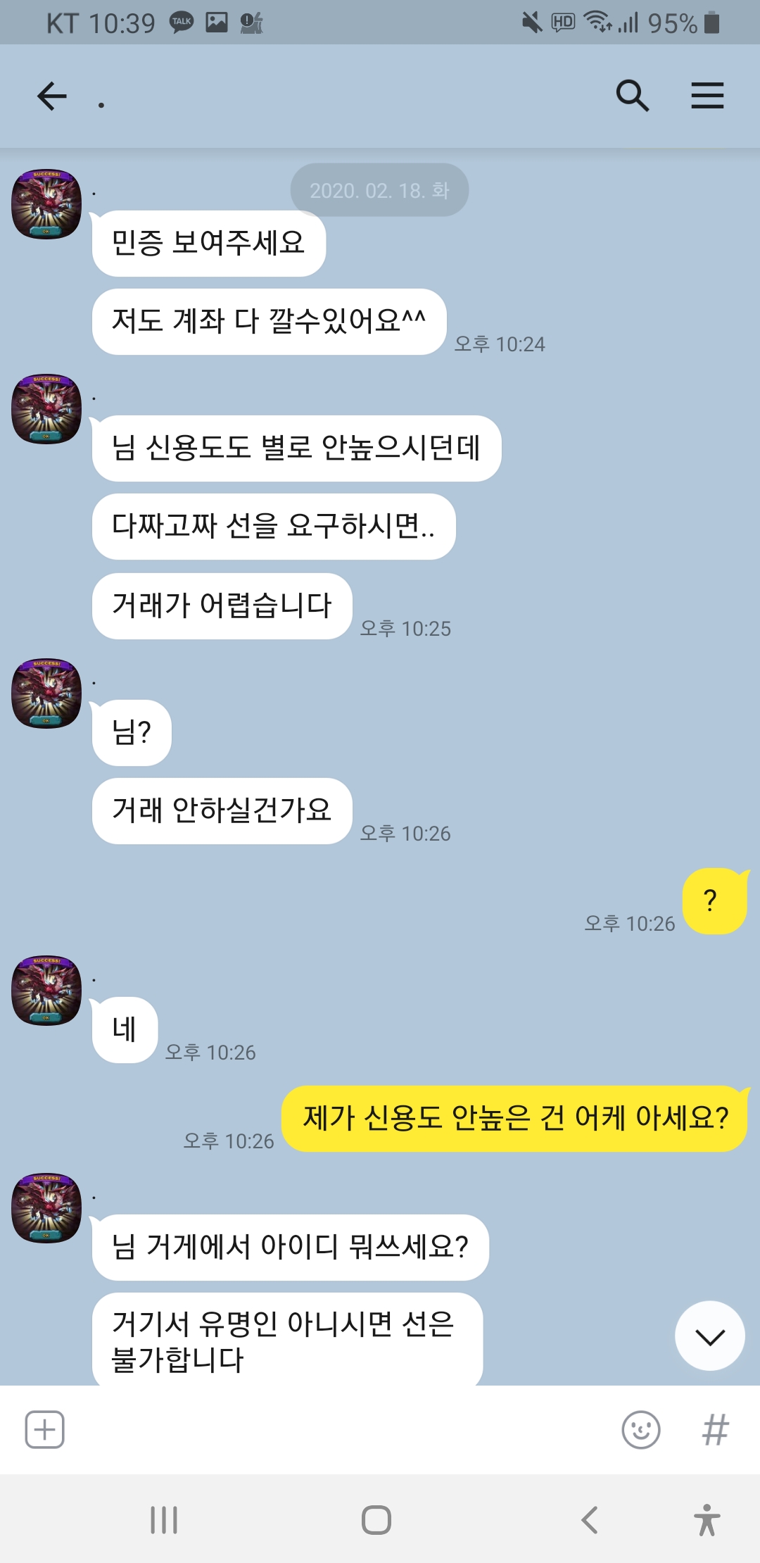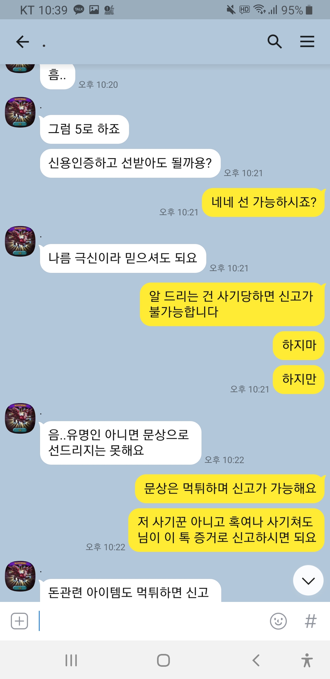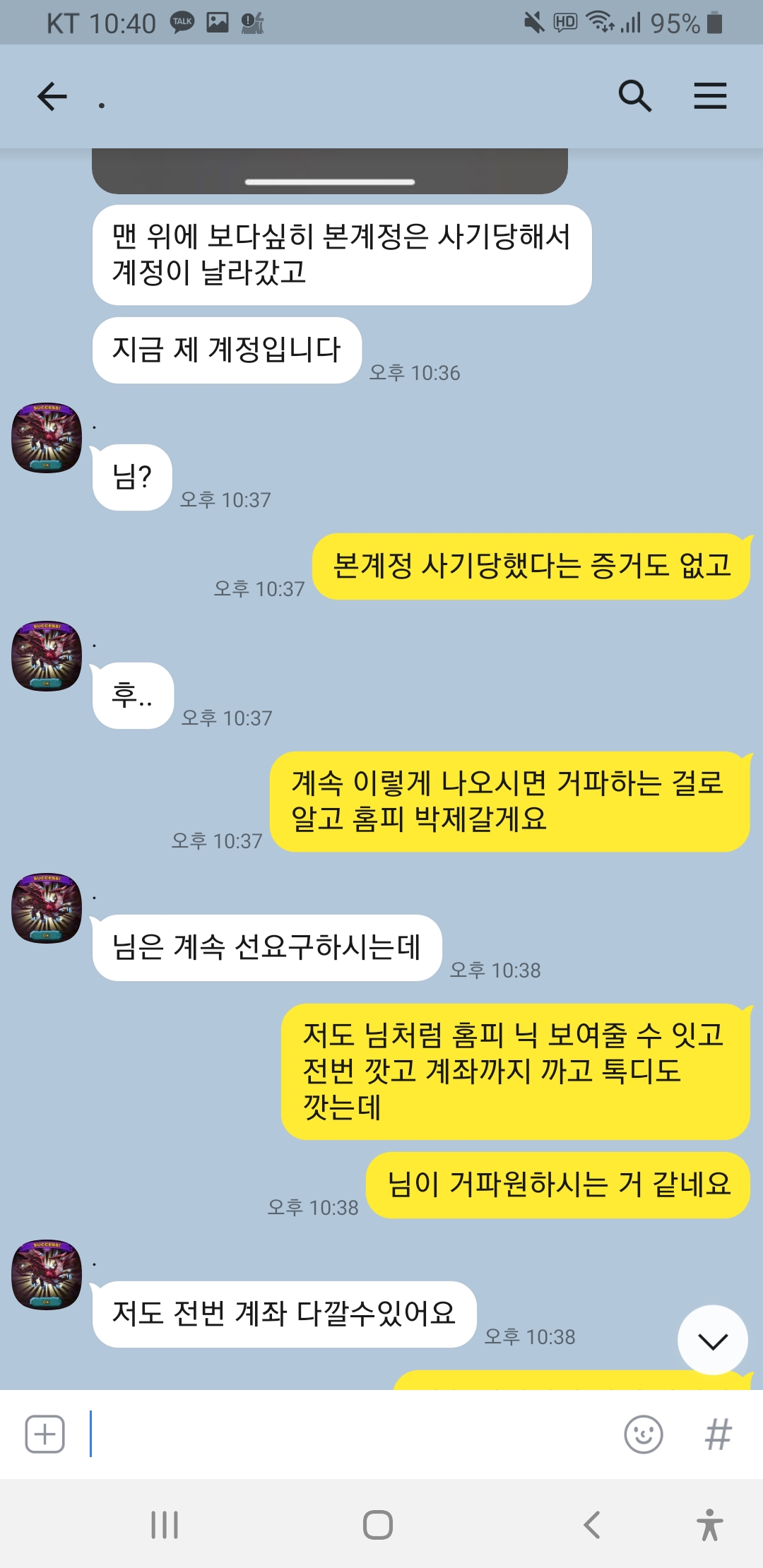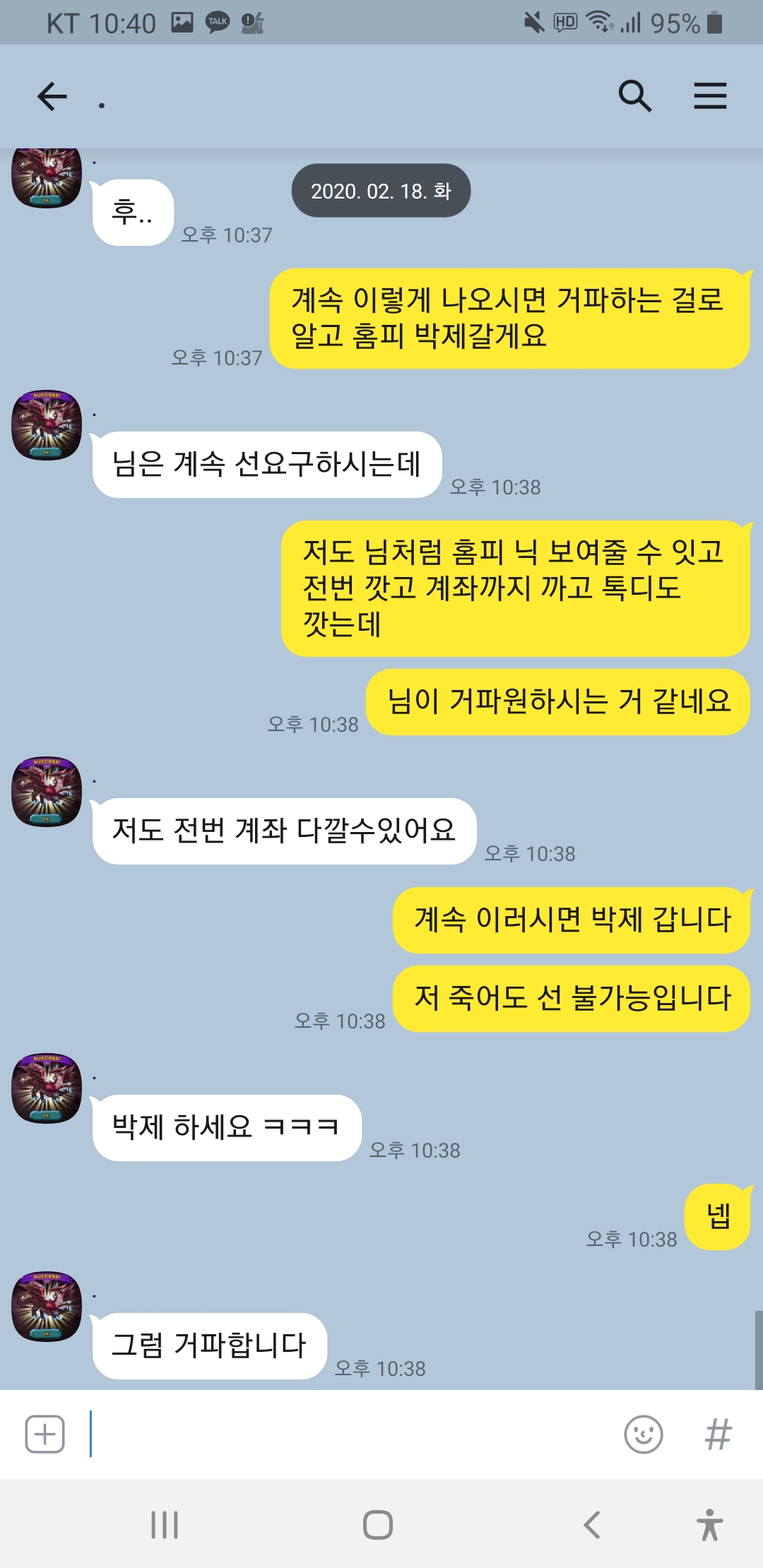 닉 드빌천사 계속 선달라고하고 제가 전번에 계좌에 톡디까지 다깟는데도 거파 원하시네요 이런 놈들은 사회에서 믿고 걸러야죠!!심지어 홈피닉 1렙에 증거도 없는데 자기가 신용인이라고 하네요ㅋㅋㅋㅋ 박제합니다!!이 분 믿고 거르세요!!
