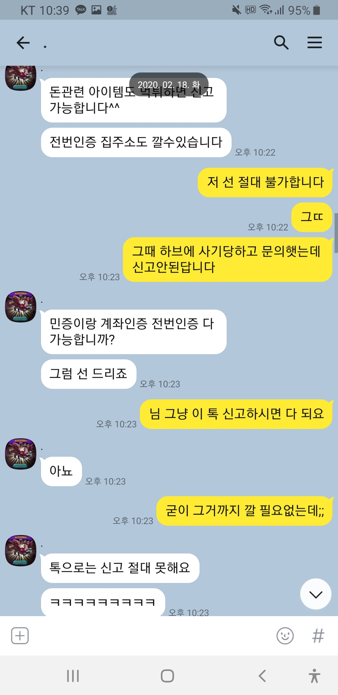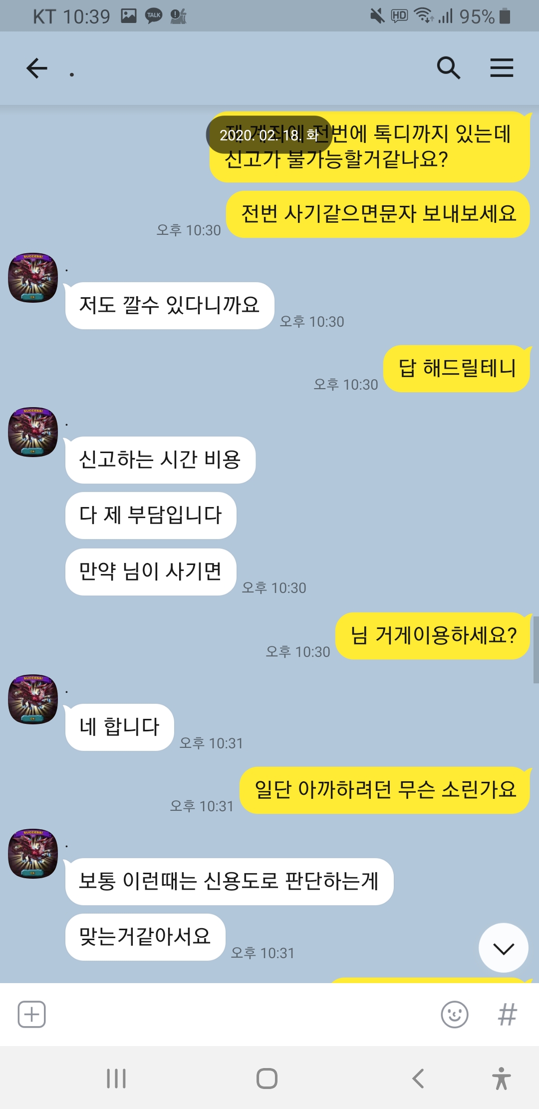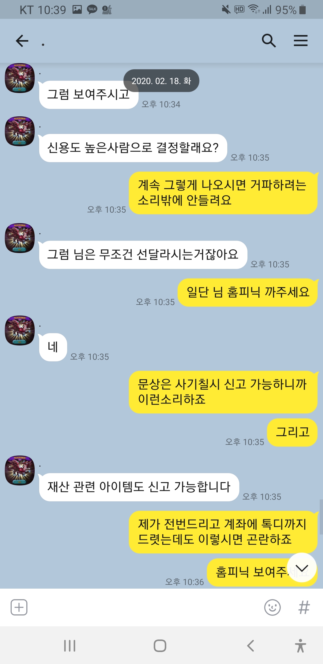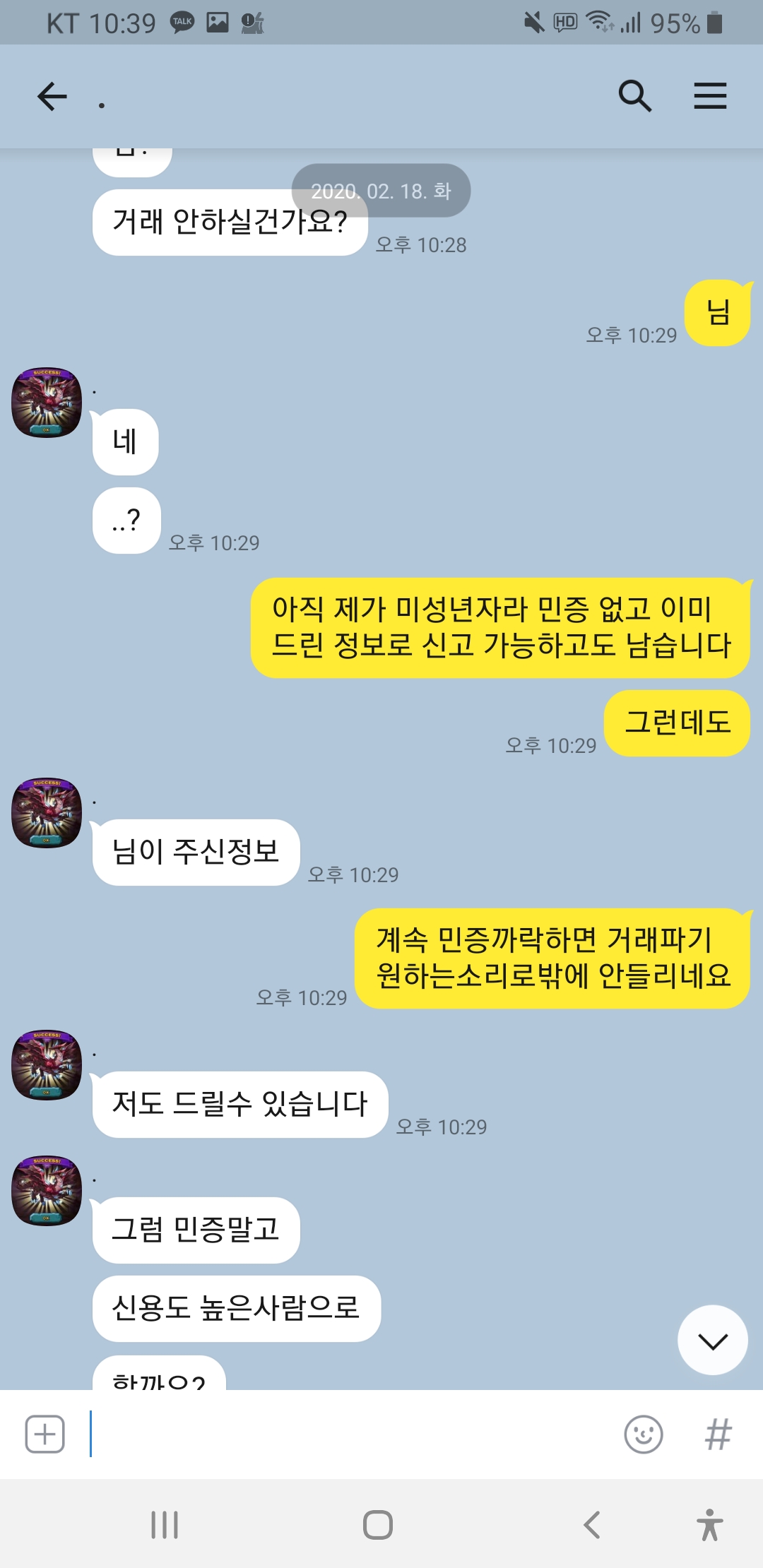 닉 드빌천사 계속 선달라고하고 제가 전번에 계좌에 톡디까지 다깟는데도 거파 원하시네요 이런 놈들은 사회에서 믿고 걸러야죠!!심지어 홈피닉 1렙에 증거도 없는데 자기가 신용인이라고 하네요ㅋㅋㅋㅋ 박제합니다!!이 분 믿고 거르세요!!