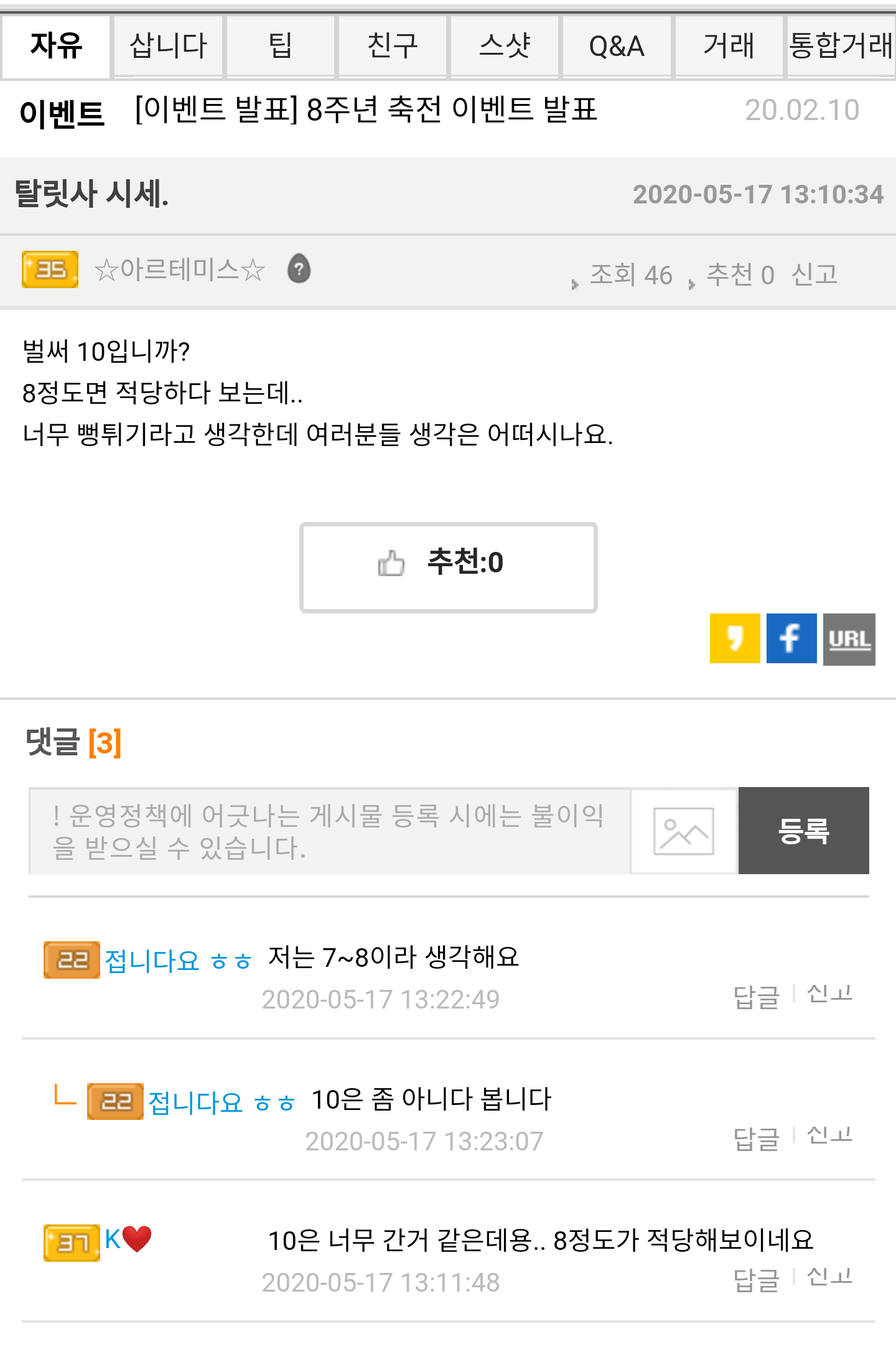막상 팔고나니 탈릿사 시세 올라가는거 꼴뵈기 싫어서 이런식으로 글올려서 시세 내리고 이게 맞다고 보냐? 정신좀 차려라;