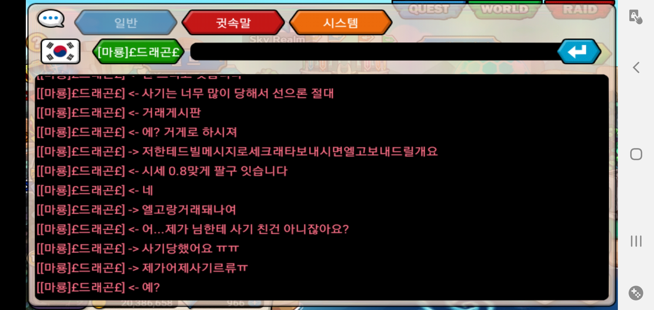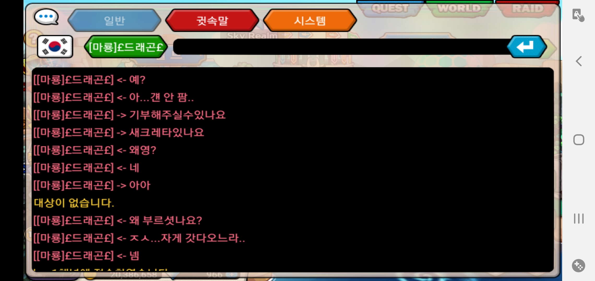상황 설명을 위한 캡쳐본...짤린 부분은 저 사람이 귓말을 다 무시하고 저 혼자 떠든 내용이라 걍 짤랏어요...