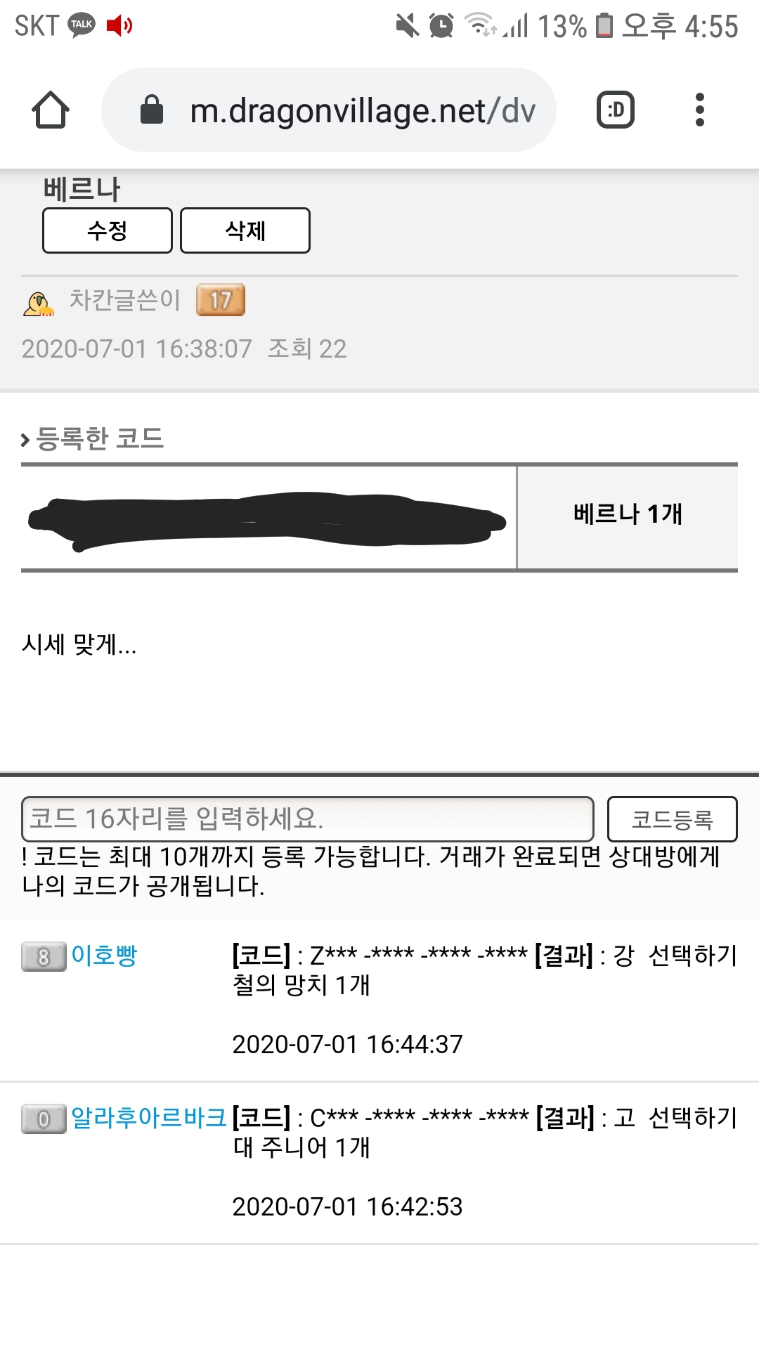 베르나 시세 개떡락 체감 중