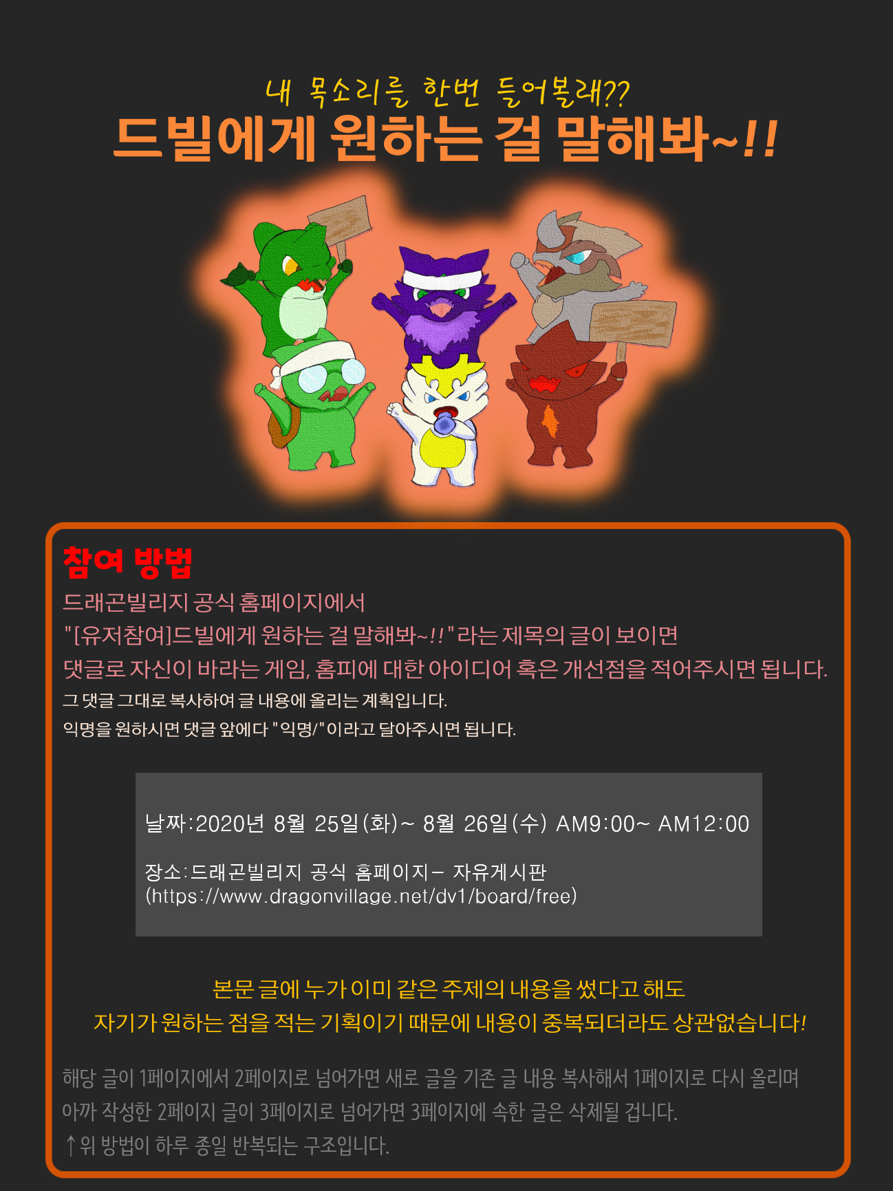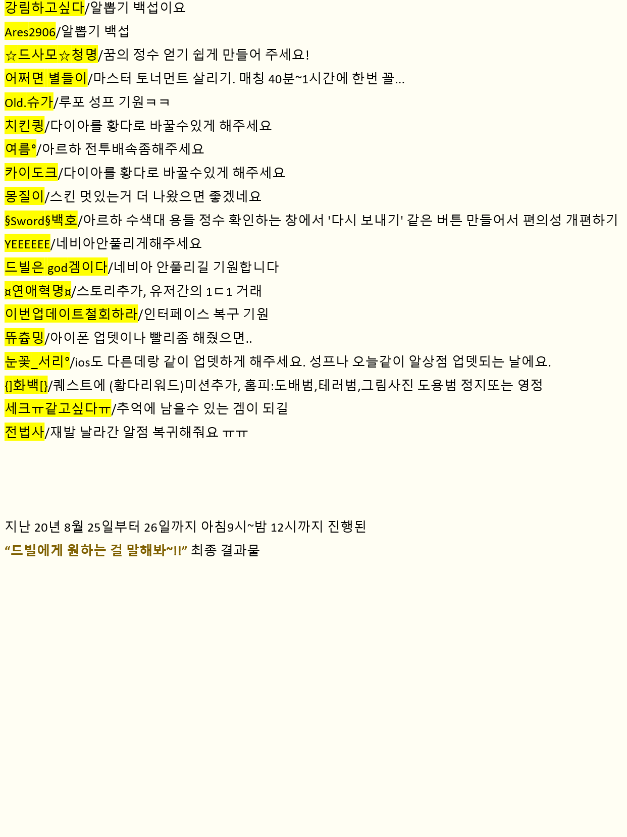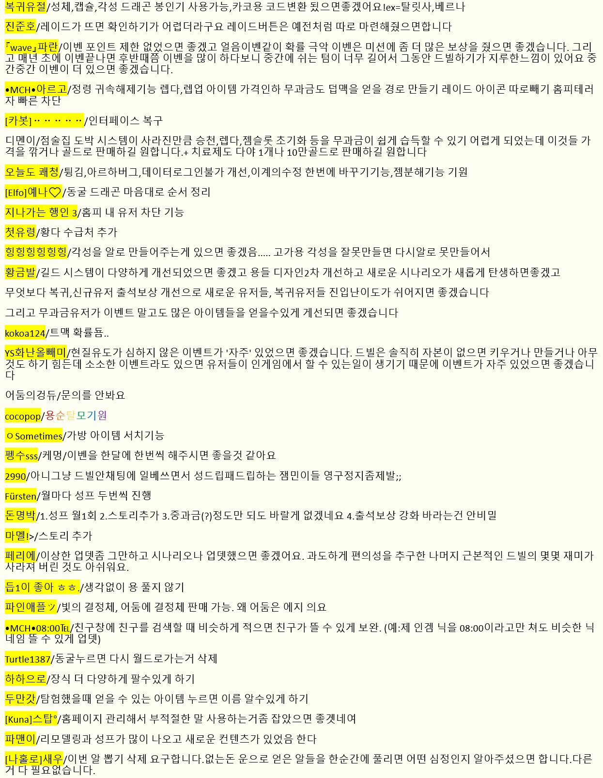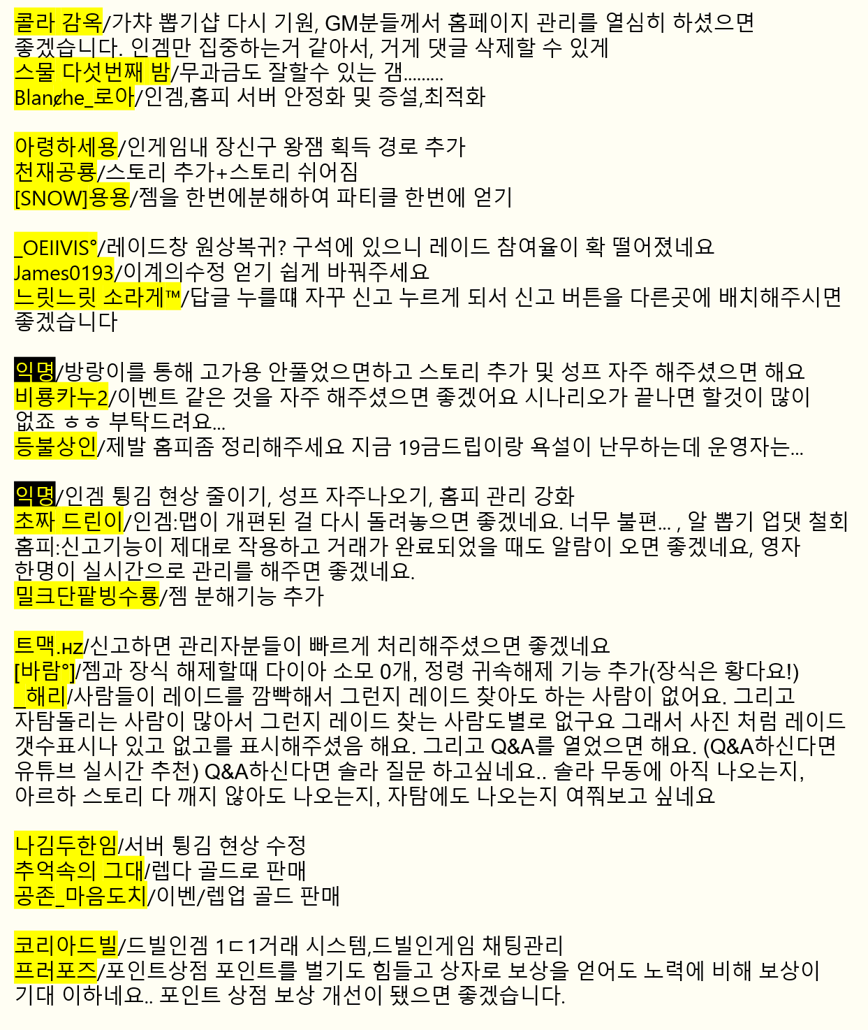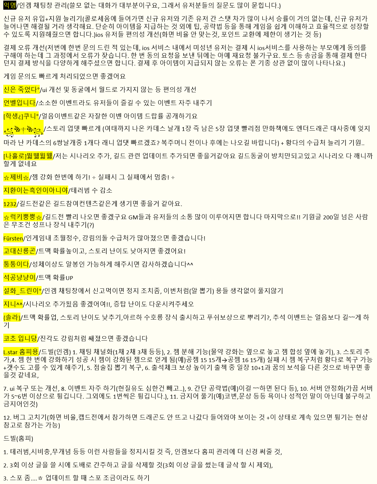 이 방법이 힘들 시다면 적어도 대규모 패치할 때, 1달간 팁 글 잘 쓴 사람들 몇 명에게 보상 주는 이벤트 실시하세요.