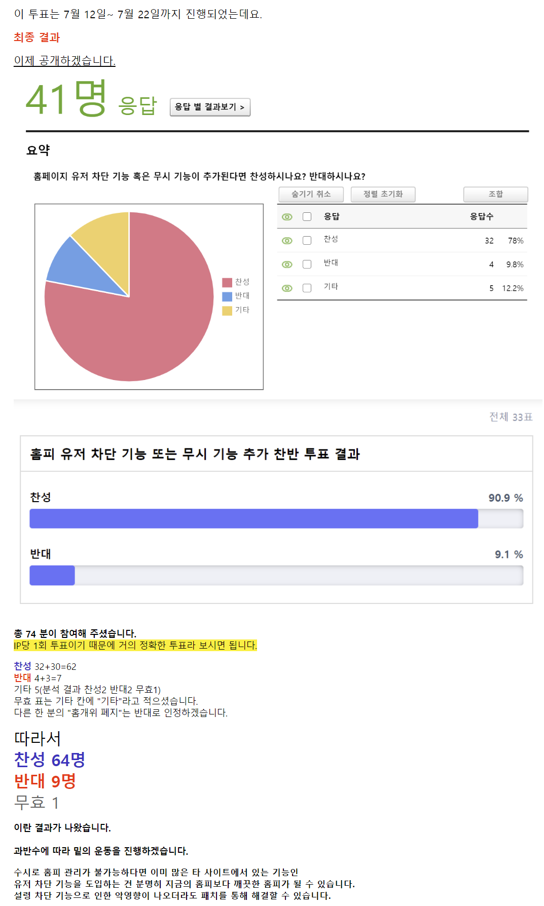 홈페이지에 유저 차단 기능 추가에 대한 찬반 투표입니다.