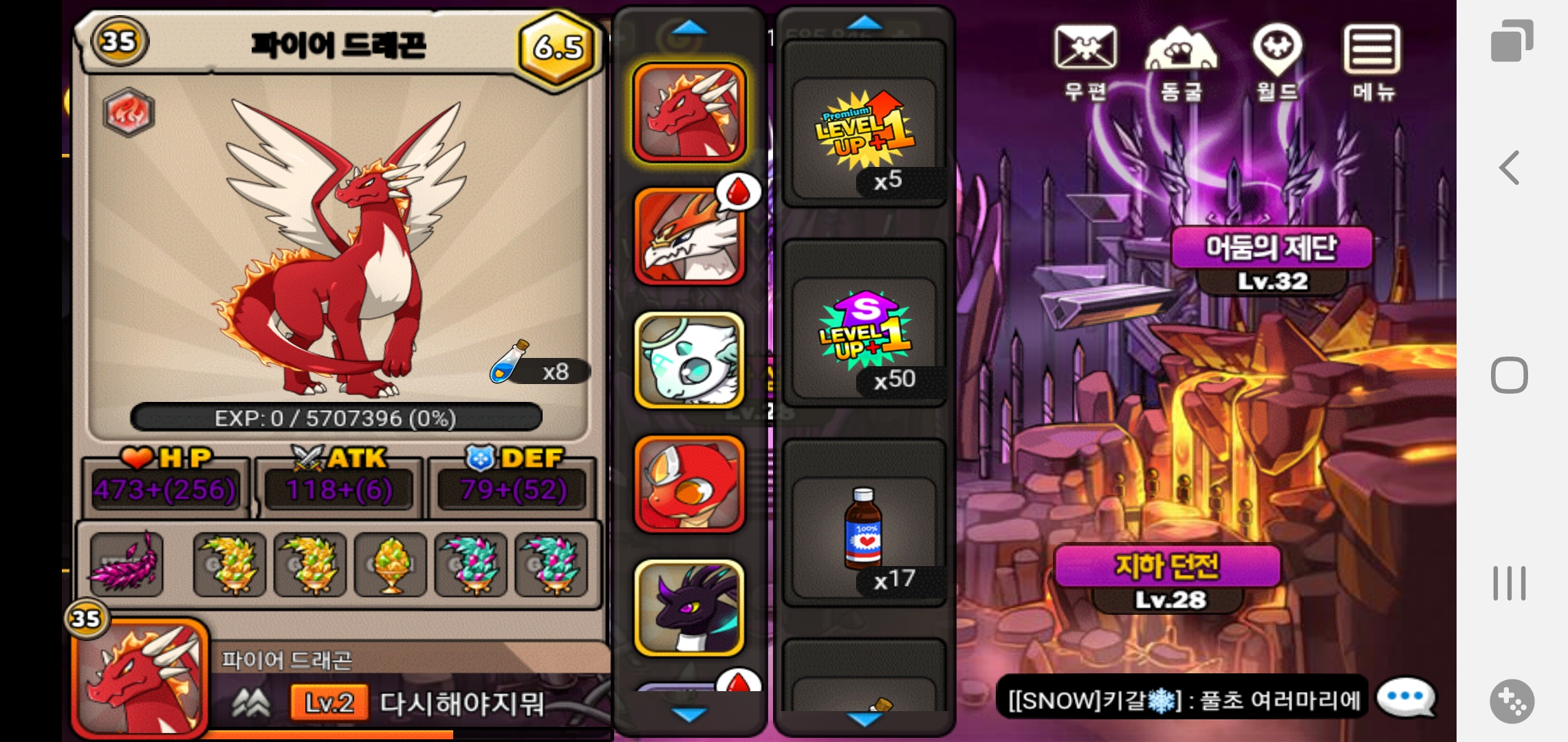 일단 처음이라 망치면 어쩌나 조마조마 해가면서 파이어드래곤 키워봤습니다. 이제 얘를 캡드로 바꾸고 캡드에서 또 각성? 으로 키우고 그러는건가요?