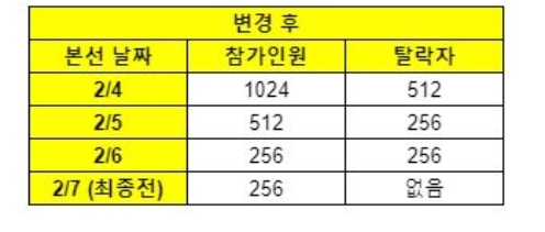 2/6 참가인원 256 탈락자 256 그럼 2/7 참가인원 0인가 ㅋㅋ