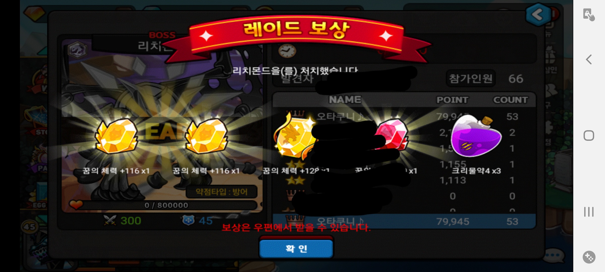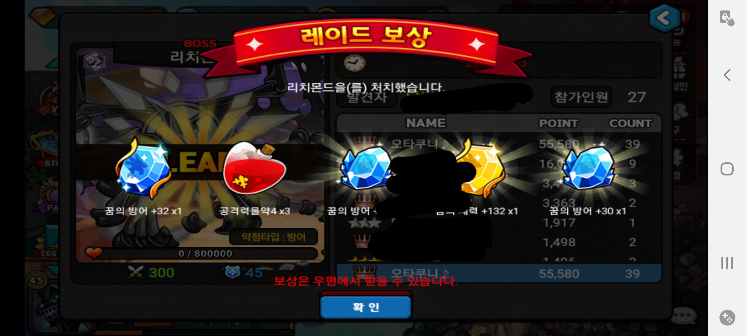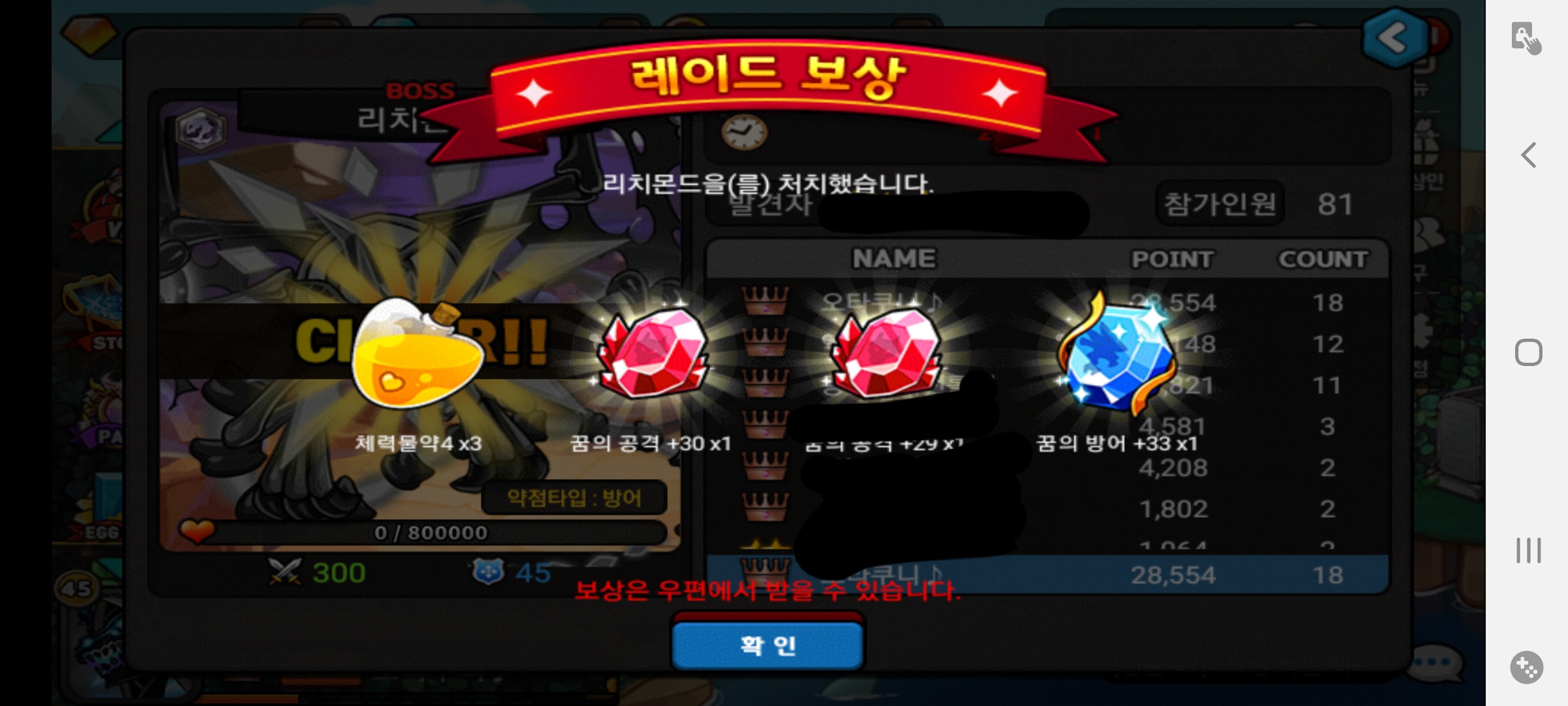 많이 해보신분들께는 별 대수도 아니겠다만.. 1등 3번 막타까지 2번 먹었는데 소환서 0개라니 100개 모으는건 정말 보통일이 아니겠네요..