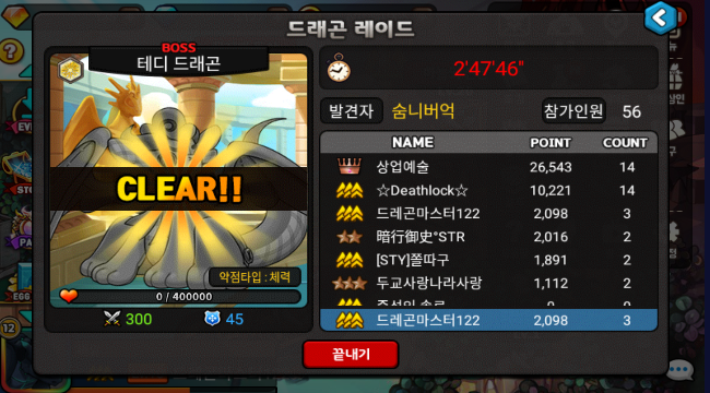 안녕하세요..즐거운 게임 도중에 분노하실법한 일이 발생한 것은 압니다..저는 레이드를 3개를 참여중이였으며 한군데 1000점을 돌리고 다른 레이드를 누르다가 실수로 같은 레이드를 눌러 막타를 치게 되었습니다. 제가 이 점에 대해서는 진심으로 사죄의 말씀을 드립니다..의도치않게 너무 당황스러워서..일단은 사과가 먼저다 라고 생각을 하여 사죄의 말씀을 드립니다. 죄송합니다. 절대 고의가 아니였으며 이미지가 손상된다 한들 이미 저지른 실수이므로 이 점에 정말 진심으로 죄송하다는 말씀을 드립니다.