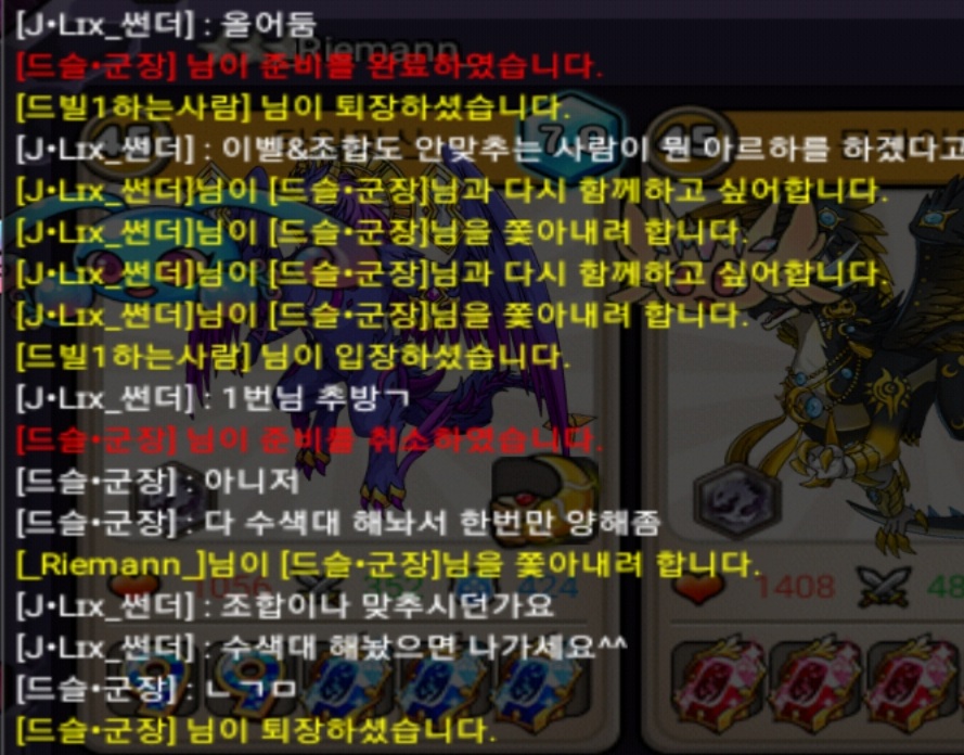 이벨도 안맞추고 조합도 안맞춰서 나가라고했는데 패드립치고 나가네욤