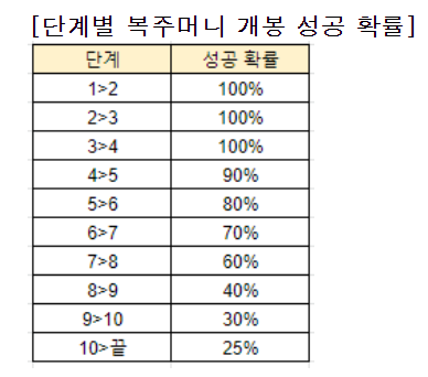 안녕하세요. 시작하기 전에 아로프님, 그리고 아로프님께 계정을 맡겨주신 5분에게 감사드립니다. 여기 있는 자료는 아로프님의 9월 24일 복주머니 깡에서 가져온 것들입니다. 혹시 8단계에서 너무 터진다, 확률 조작이다라는 의심이 드신 분들은 여기 약 1000개의 복주머니 자료를 갖고 판단해보시기 바랍니다. 물론 동전을 두 번 던져서 앞면이 나왔다고 확률이 100%가 아닌 것처럼 1000개도 충분한 샘플이 아닐 수 있습니 참고하고 봐주세요.