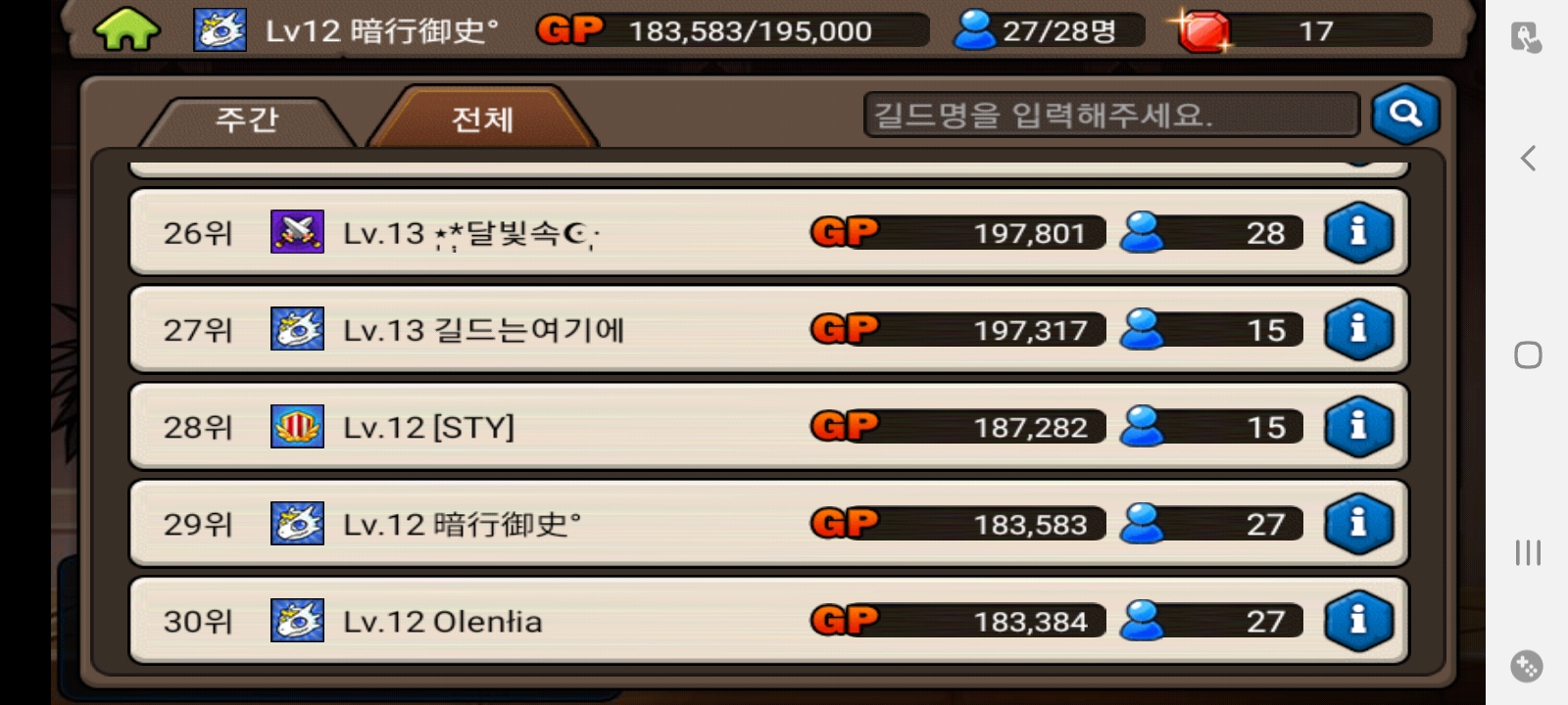 전체랭킹 29위 길드에서 길원구합니다. 많은 지원부탁드립니다.