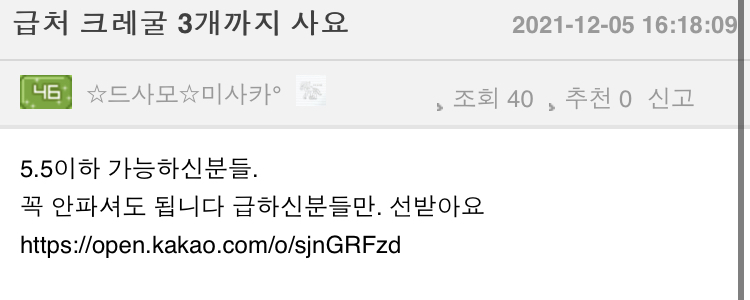 미사카님 고가용도 많이 모으시고 열심히 하시는건 보기좋은데 뭐 난 레이드도 안해서 상관없긴한데 크레굴을 개당 5.5에 산다고? 이건 무슨 6으로 레굴 구하시는분도 봤는데 뭐 레굴 요즘 4정도에 팔리는갓같긴하다만 미사카 저분도 3루드 등등 하시면서 인지도 꽤 있으신분인데 저 사람이 크레굴을 5.5에 구한다고 올려놓으면 몇몇 사람들은 저게 시세인줄 알게되는 사람들이 분명 생길거임 원하는걸 싸게 구하는건 괜찮은데 말도 안되는 가격으로 시세를 너무 낮추진말자