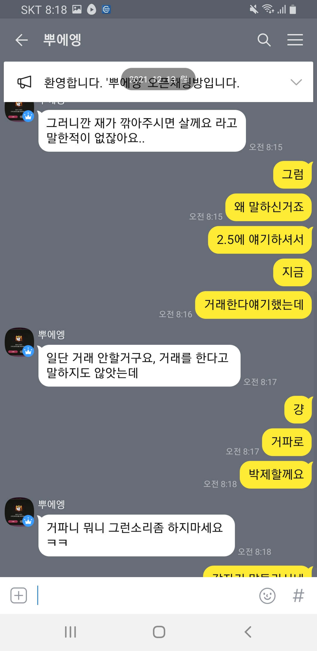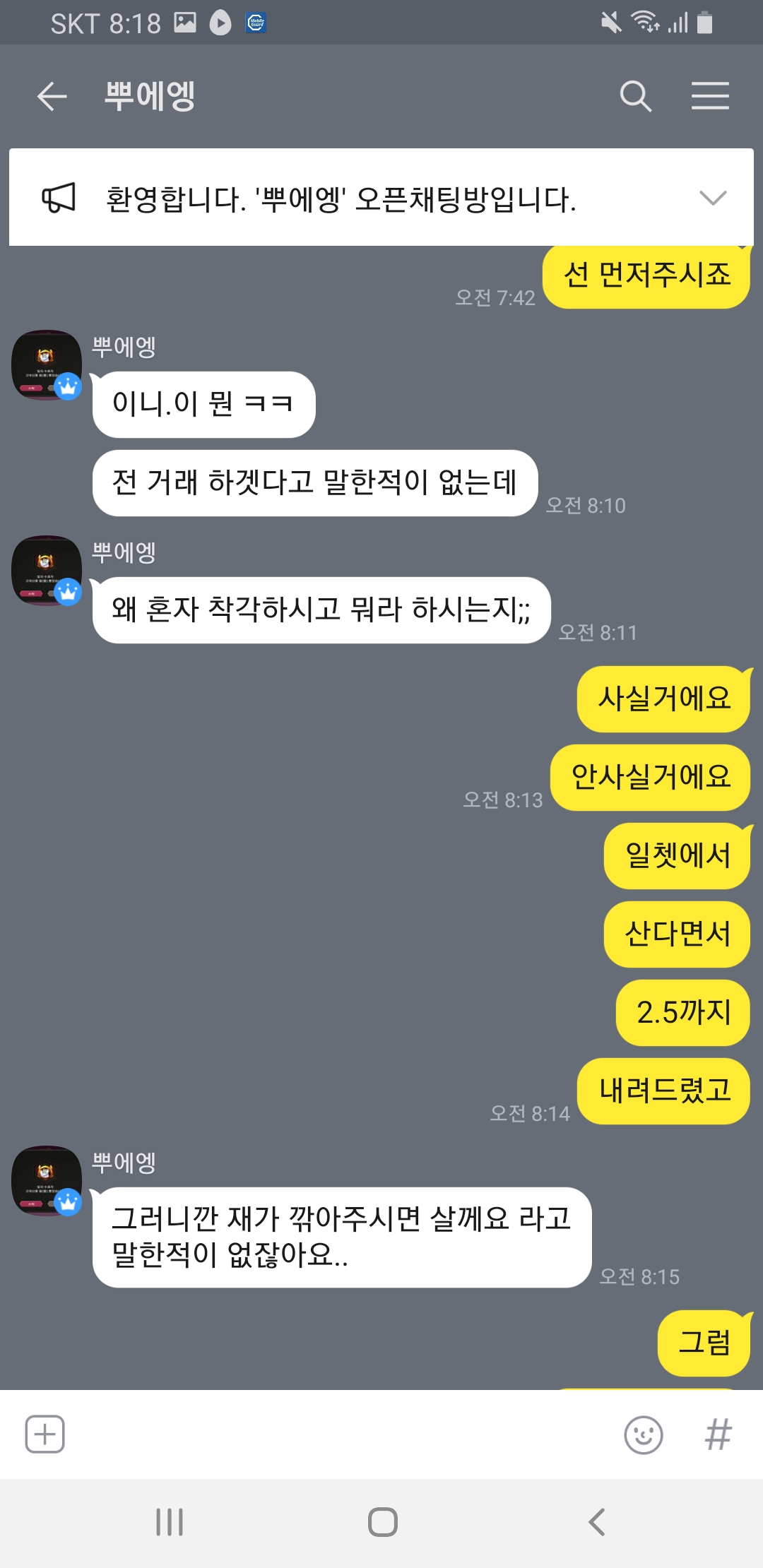 전에 보신분도있겠지만 일쳇에서 사실분만 귓달라했는데 무길공책님한테 귓이왔어요 제가 그분보고 타나 2.6되냐 물어봤어요 근데 최근에 높게 본게 2.5라고그러더라고요 그래서 2.5에해드린다했는데 귓을안보는거에요 카톡으로물어보니 자탐중이라네요 하루뒤에 선달라하니 이렇게보내네요
