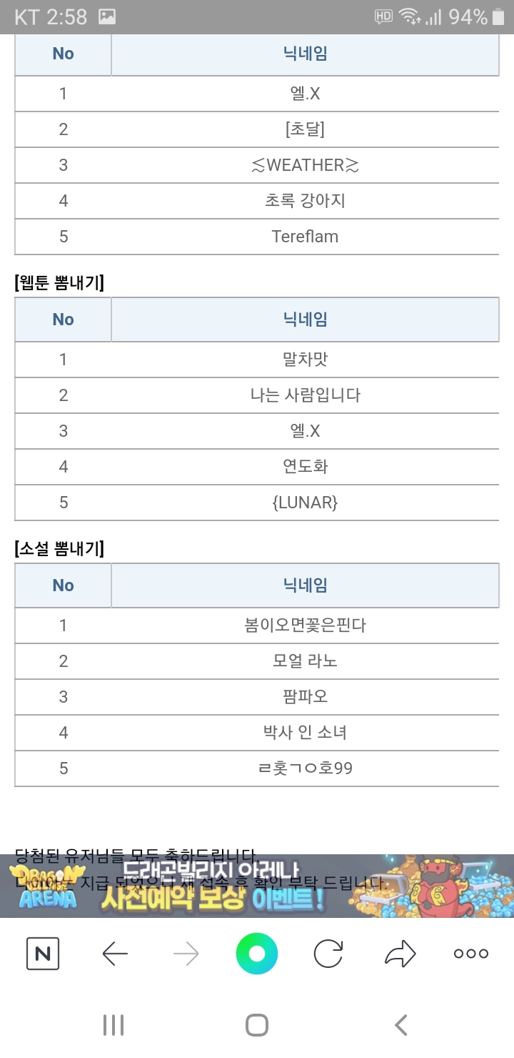 제가 소설 뽐내기 4등했데요