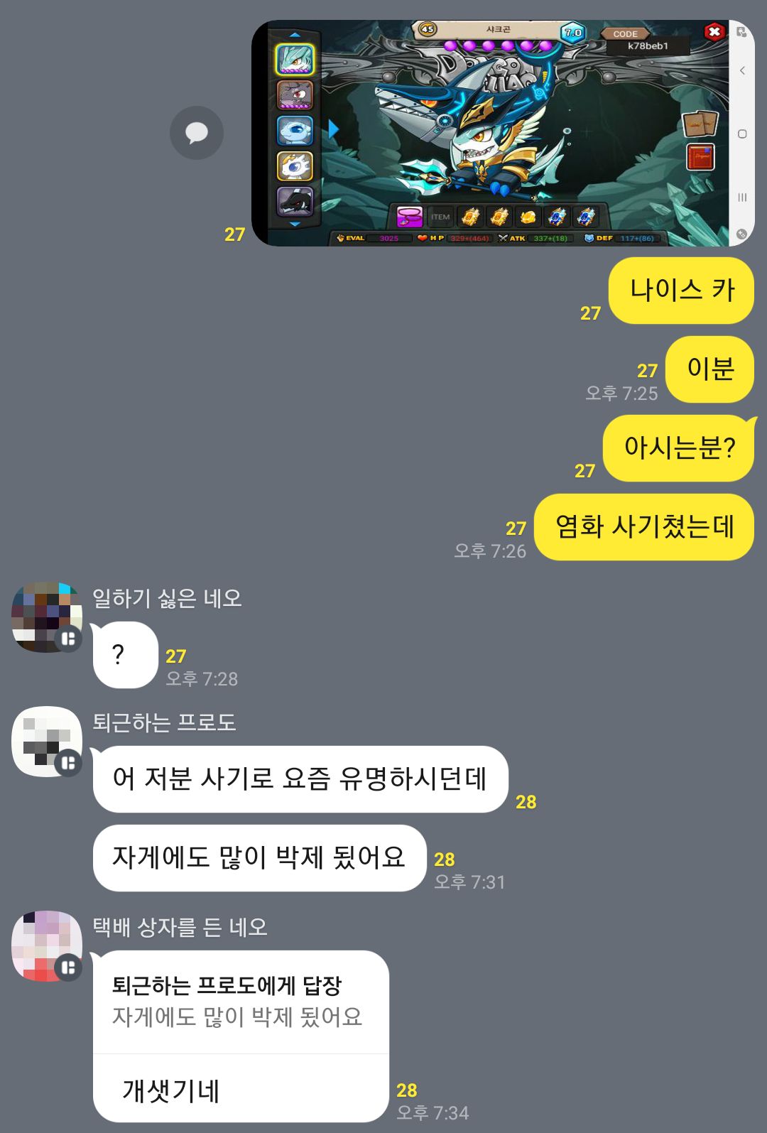 동굴좀 키워놓았길래 난 설마하고 사기안치리라 믿고 걍 선으로 보내줬음 근데 바로 차단 박는거임