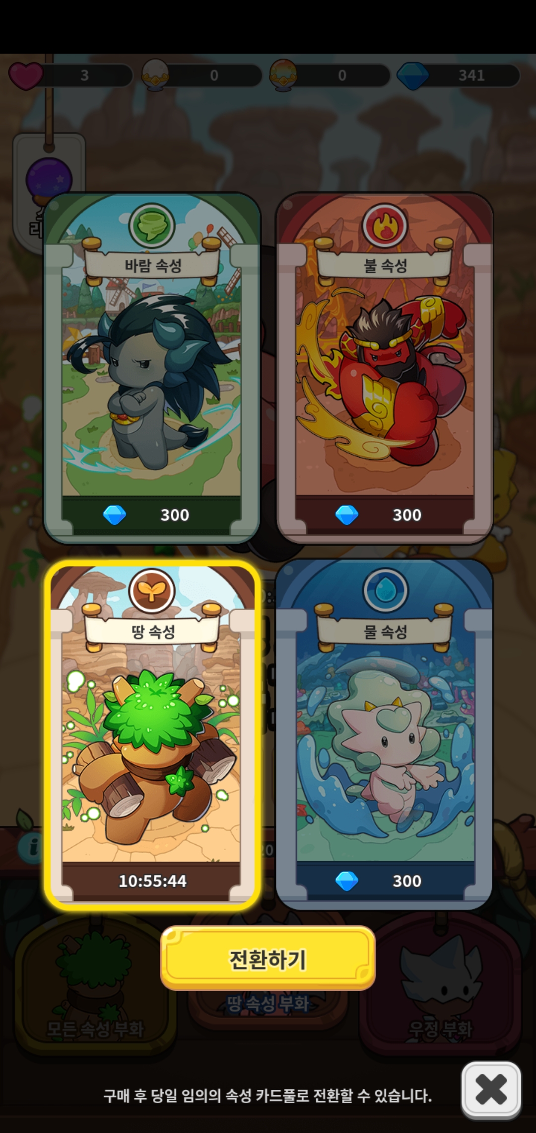 그리고 속성 뽑기는 4속성 중 1가지로 정해지는데 기간마다 돌아가면서 바뀌고, 원하는 속성으로 바꾸려면 보석 300개 써야 합니다.