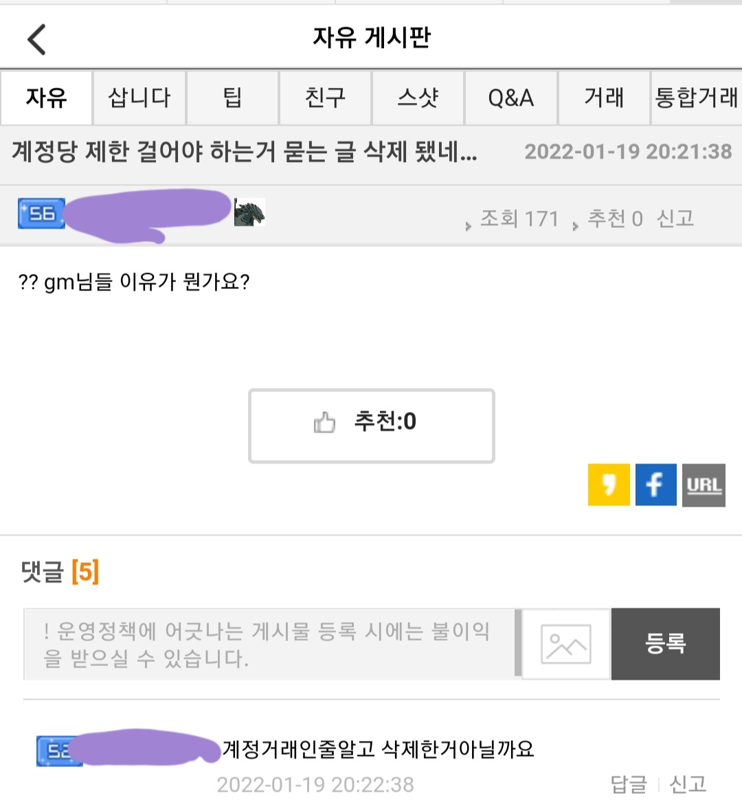 5. '계정' 들어갔다고 글 삭제