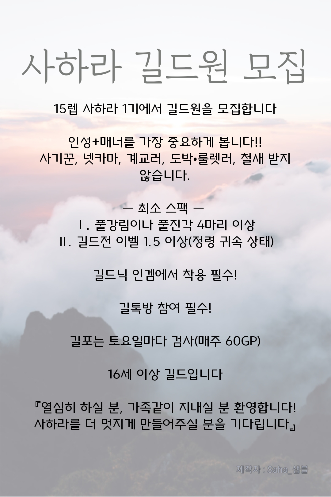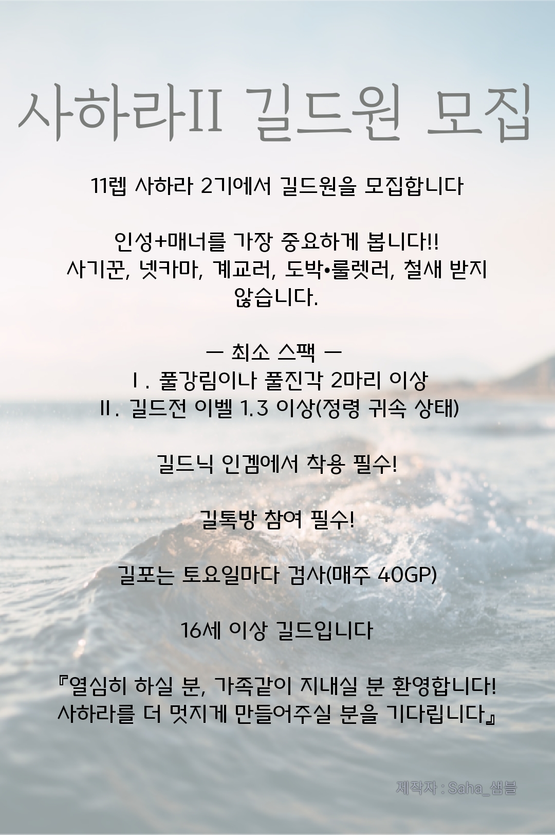 길드닉은 Saha_ 《Player》 입니다. { 《 Player》 자리에 닉네임 넣어주시면 됩니다 !! }