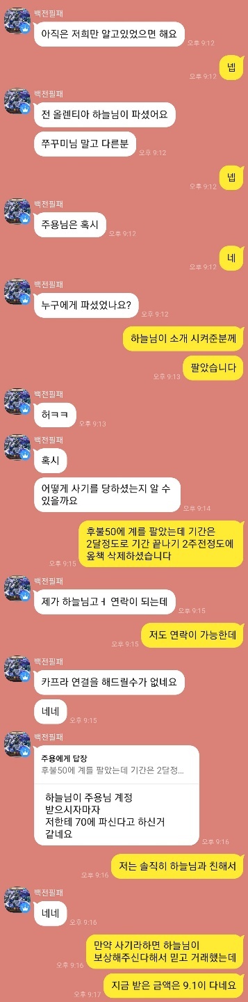 그러니 요약하면 하늘님이 옾프 2개를 파시고는 한개를 구매자로 위장하여 계정을 받고 대금날이 되자 부옾프를 삭제한 후 계정을 팔아버리고 주용님께 일부만을 드렸다는 이야기가 되겠죠