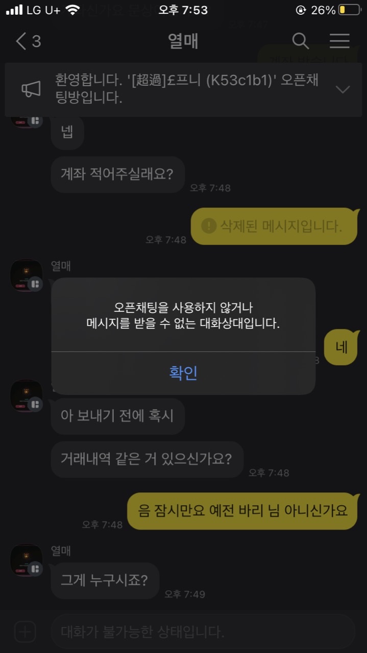 예전 카톡 옾프 닉이 바리였는데 그분이 선무새 길래 안했는데 뭔가 카톡 옾프 사진도 그렇고 똑같길래 바리님 아니냐고 물어보니까 바로 나가버리는 클라쓰 뭐죠?