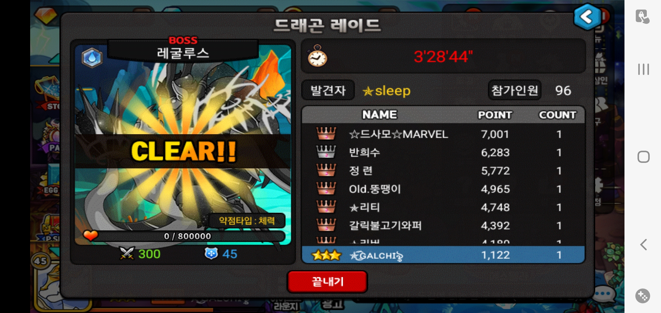 sleep님 레굴 레이드 12만에 들어갔는데 막타가 되버렸네요