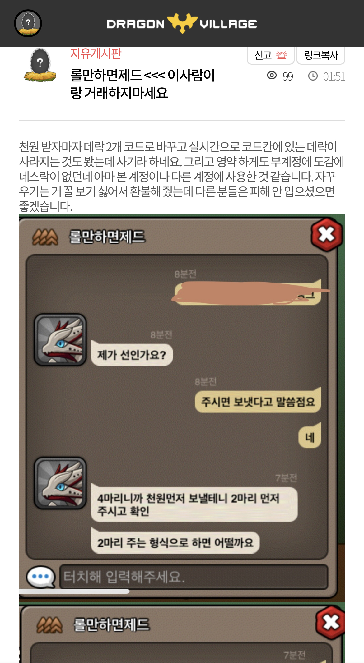 뻔뻔하게 사기치시고도 이렇게 자게에 올리는걸 보면 정말 말이 안나오네요 ㅋㅋ 애초에 제가 선 드렸고 그쪽이 이사코 준건데 저보고 사기라고요? 인증까지 하래서 인증할려고 톡아이디주니까 신상털릴까봐 옾쳇으로 하자하고 ㅋㅋ 동굴인증이랑 싹다 인증했는데 갑자기 말 봐꾸면서 사기꾼으로 몰아가놓고 이렇게 빤뻔하게 글까지 올린다? 말이 안되는데 디스코드로 같이하고있던 친구들도 다 거래하는거 똑똑히 다 보고있었는데 계속 친구 대리고오라고 하는데 거기에는 드빌안하는친구와 초대받아서 얘기하고 싶지 않은 친구도 있는데 억지로 변명부리지 말라서 얼른 대려올거아니면 나가라면서 ㅋㅋ 면박주는게 대려오라는 태도인지 애초에 반말도 먼저하시고 애초에 친구들은 이상한 사람이라고 나오라고 해서 나갈려다 억울해하니까 오해는 풀자는 마인드로 계속 말 이어나가도 자기 할 말만 하고 이렇게 게시까지 해버려 드빌안에서는 사기꾼으로 낙인되어 버릴까봐 걱정이네요 ㅠ 누가누구보고 사기라는건지 참;ㅋㅋ그리고 도감에 데스락이 없는이유가 없으니 거래를 통해 구할려고 하는건데 뭔 사람하나 몰아가겠다고 소설까지 써가며 저러고 싶을까라는 생각이 드네요 이분은 제가 사기쳤다하는데 사기를 칠거면 굳이 계좌로 선입금하고 계좌로 사기를 칠경우 신상까지 알수있다는걸 알면서도 사기를 칠거라고는 생각이 들지도 않고 이런거래말고 저와 정상적인 거래를 한분들이 더 많다고 생각이 드는데요 그리고 이 자게떼문에 사기프레임이 씌어져 거래를 못한부분도 있는데 만약에라도 서로 오해가 있거나 오류떼문에 이런결과가 생긴거라면 무슨생각으로 이런글을 올리셨는지 궁금하네요