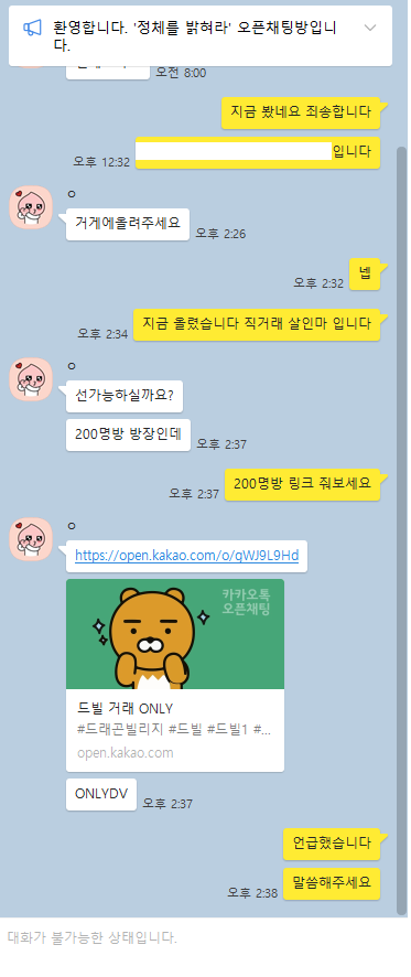 당연히 아닐 거 알고 방 언급해보라 하고 혹여나 맞다면 오픈톡방 방장이 선 요구하고 다니냐고 하려고 했는데 사칭하고 다니네요 꼭 거래방 방장이다 선달라 하는 가정사 처참한 친구들 있으니 그 방 들어가서 언급 한번 해보세요 혹시라도 진짜 거래방 방장인데 선요구 했다면 그거대로 문제입니다 선요구 할 거면 직접 와서 대면하고 요구해주세요~