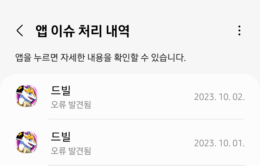 그리고 이렇개 폰자체내 기능에서 앱이슈처리내역에 드빌이 여럿 기록이 되어있었습니다