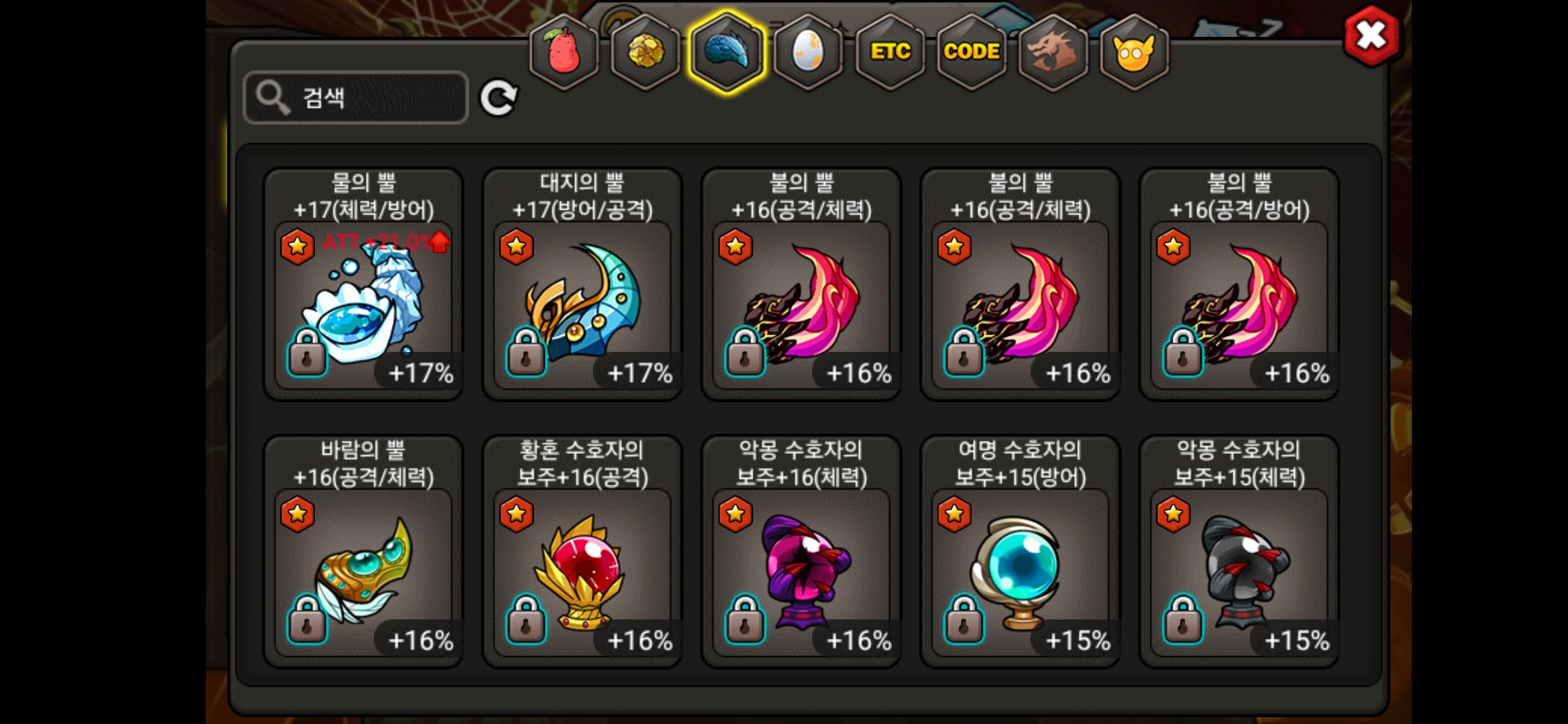 이외에도 대뿔 17 방/체 악보주 17 체력 불뿔 15 공/방 물뿔 15 체/방
