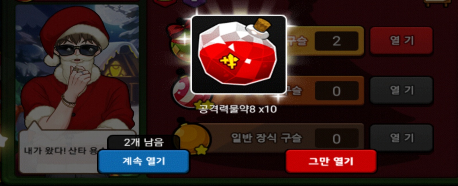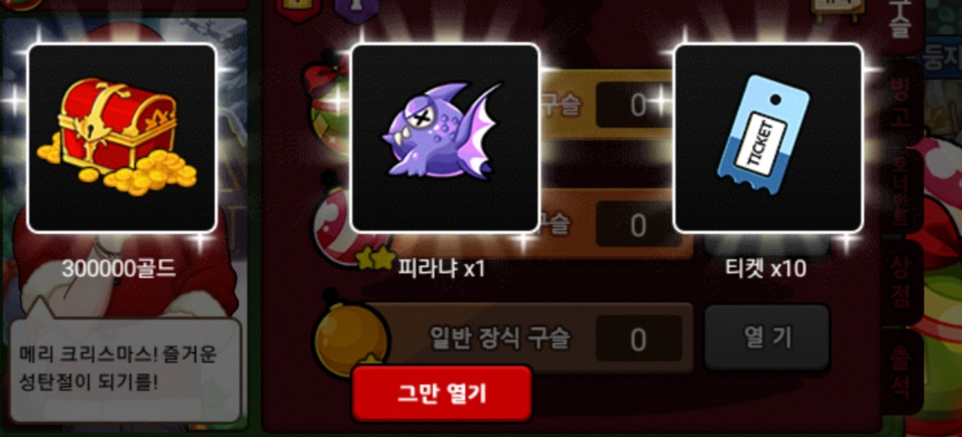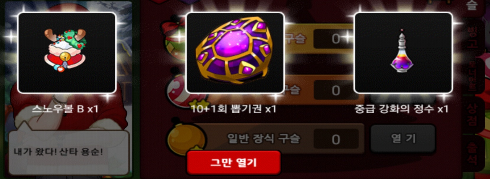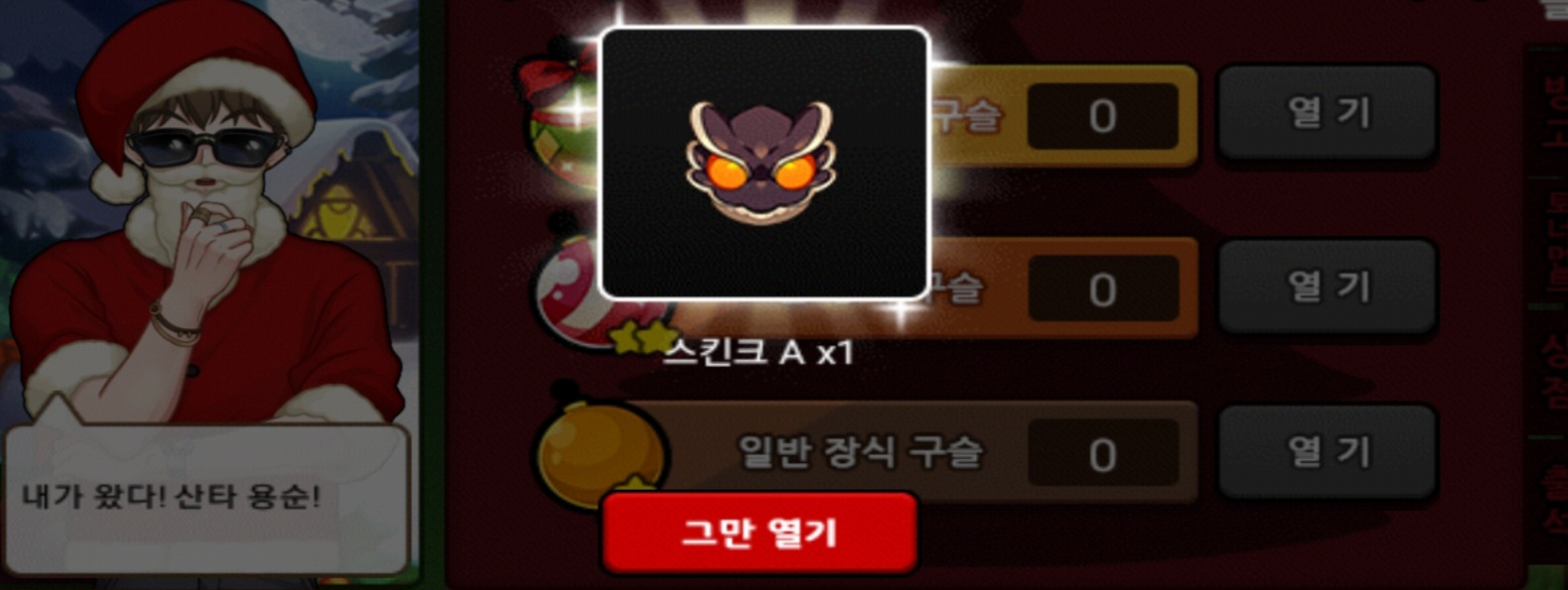 저는 이번 크리스마스 이벤 때 총 18정도 질렀는데 얻은게 저런 등급용,물약,어둠뿔 하나가 다네요 ㅎㅎ...