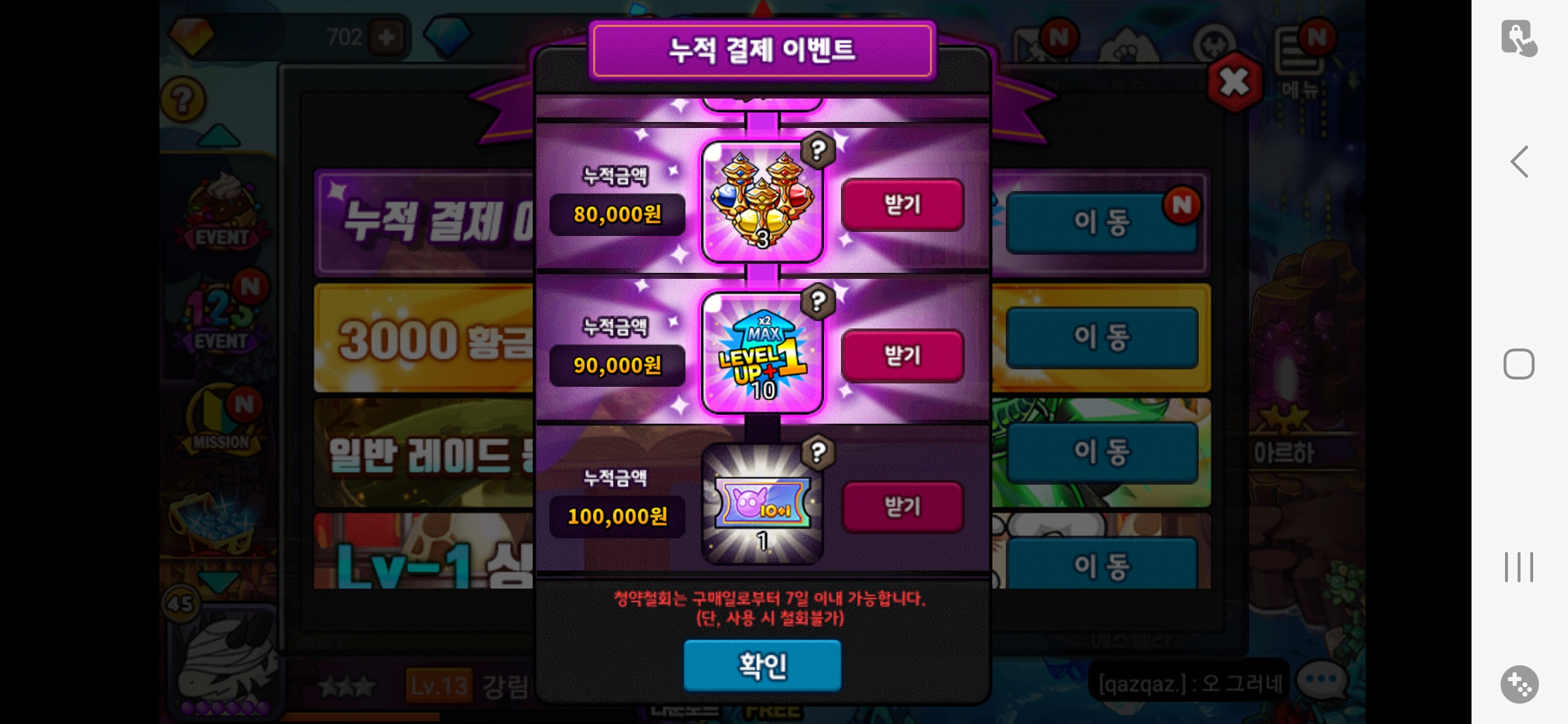 내가 다야패키지 22000원 정령패키지 33000원 레프 5번 사서 10만원이 넣는데 결제 누적이 10만 안돼서 정뽑 못받네 심지어 레프 1개 보상 안들어옴