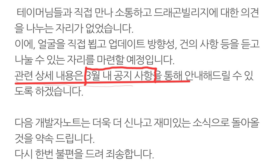 3월 내로 공지 한다고 했지 3월 내에 간담회를 연다고 한적은 어디에도 없습니다. VIP 문의 결과 간담회 공지는 4월 초까지 늦어질수 있다는 답변을 저번주에 받았습니다.